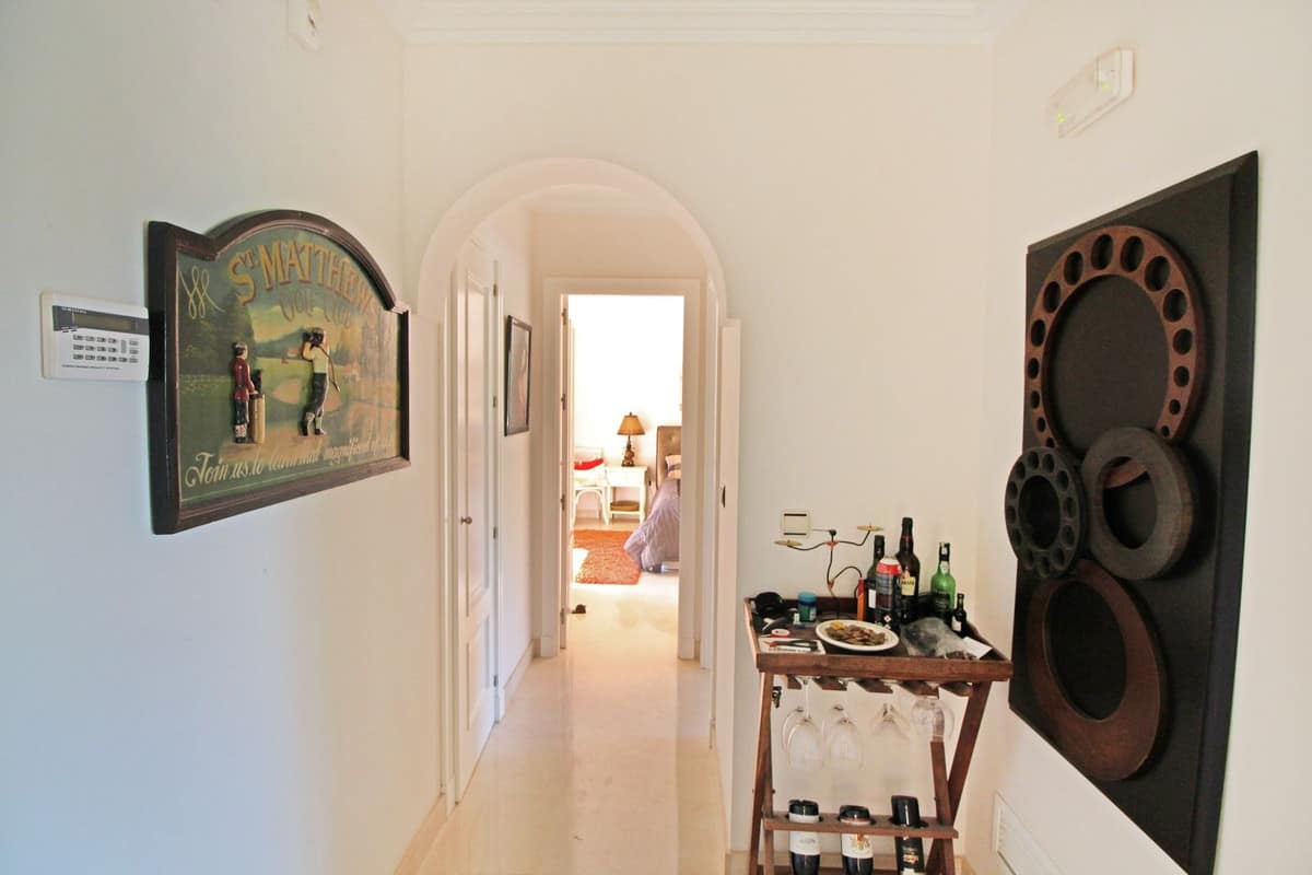 Experience the refined lifestyle at San Roque Club with this beautiful 2-bedroom, 2-bathroom penthouse, positioned frontline to the golf course. The expansive living and dining area features a cozy fireplace, a vaulted ceiling, and large sliding doors that open to a spacious terrace with panoramic views over the prestigious Old Course.