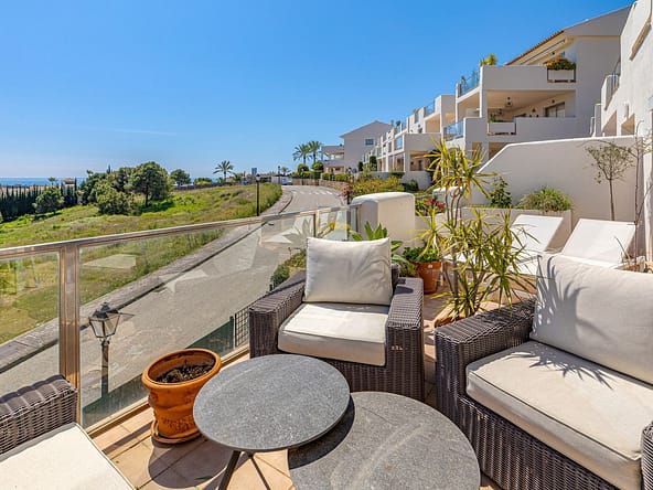 This exceptional elevated ground floor corner apartment for sale in Estepona East offers panoramic Mediterranean sea views, privacy and premium outdoor living in one of the most sought-after areas of the Costa del Sol. Located within a boutique development of only 12 units, this property combines Mediterranean architecture with modern comfort, making it ideal as a holiday home, permanent residence or high-potential investment property in Estepona.