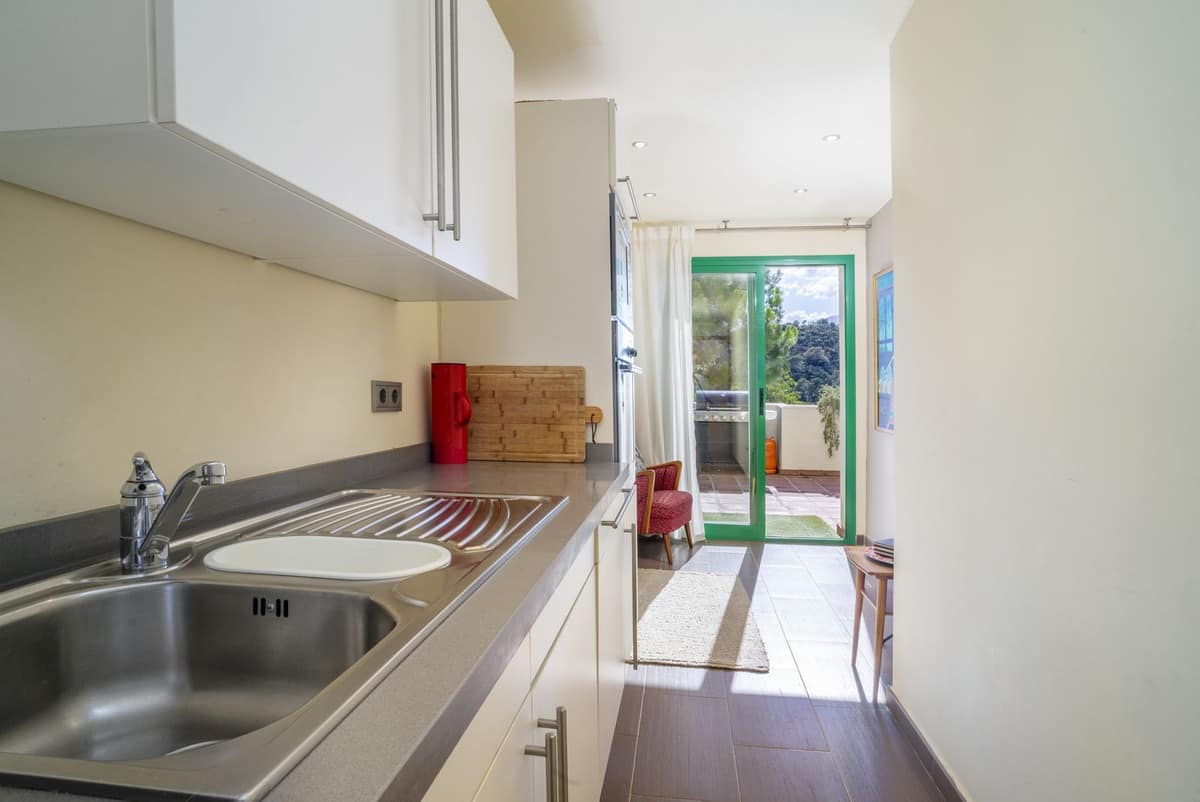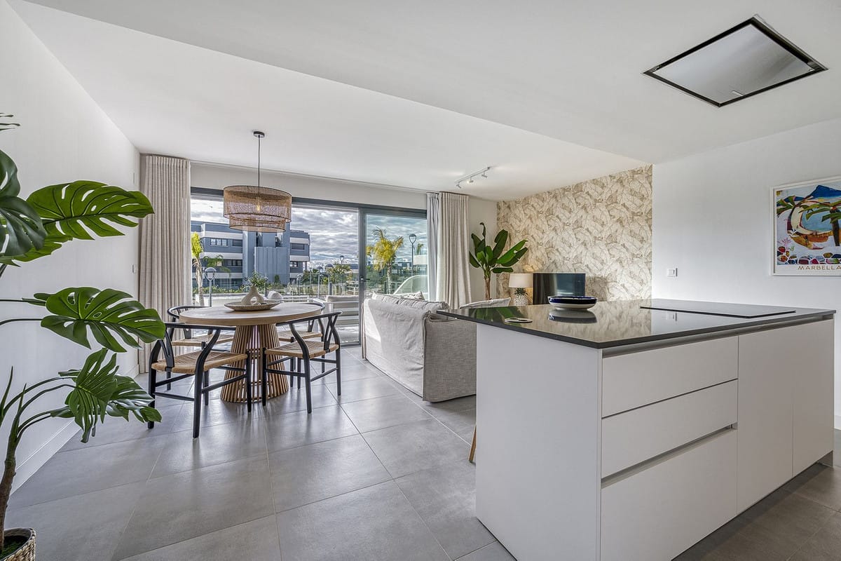 This elegant 2-bedroom, 2-bathroom apartment is located on the first floor of a modern residential complex in La Resina Golf, Estepona. The property features a spacious 31 m² terrace with beautiful open views over the tropical landscaped inner garden, creating a calm and relaxing atmosphere.