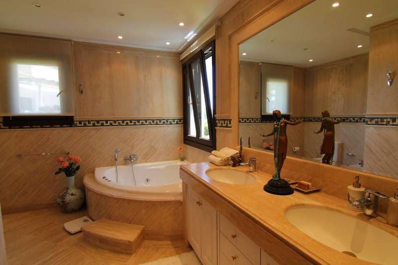 Exquisite lounge/dining area with open fire place feature, leading out to a superb sun terrace with sea and mountain views. Separate office /study off the dining area. Superb large terrace for dining “al fresco” or relaxing taking the sun. Awnings, mosquito screens and ceiling fans facilities. Beautiful fully equipped kitchen with top appliances, American fridge freezer and granite work tops. Separate utility area with washing machine and dryer.
