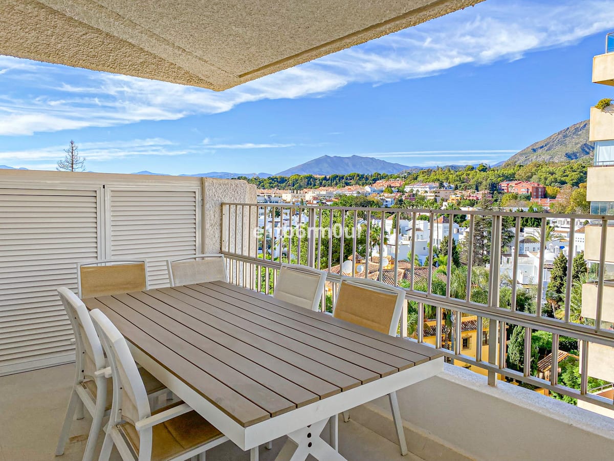Beachside recently reformed, to a very high standard, apartment that is ready to move into. This fabulous bright, spacious, airy apartment is a perfect home or investment property. The location is ideal, only a three-minute walk to the beach and Marbella’s Paseo Maritimo. A short walk into the centre Marbella and 5 minutes from Puerto Banus. With an open-plan layout, the fully fitted kitchen flows effortlessly to the dining area and living room. The two double ensuite bedrooms are distributed on either side of the living room area ensuring privacy and giving both bedrooms access to the spacious terrace. The terrace has a seating area and an outdoor dining area that comfortably seats six people and enjoys panoramic views over the Golden Mile and towards the mountains. The community has beautiful quiet gardens and two swimming pools. There is communal car parking for residents.