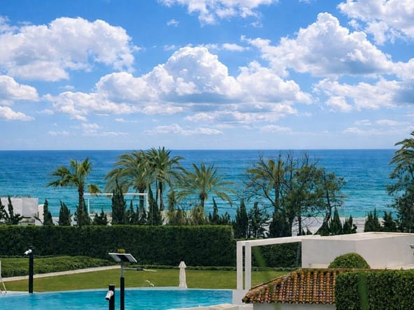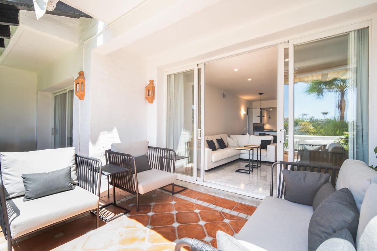 Exquisitely presented ground-floor apartment located in a 24-hour secured complex in Las Lomas del Marbella Club, in the heart of the Golden Mile. The property has been completely renovated and makes incredible use of the open floor plan that blends the kitchen, living room and large outdoor terrace seamlessly. Large floor-to-ceiling windows open up from the living room to a lush tropical garden and covered terrace with adjustable glass curtains that can be opened in the summer months to provide an incredible entertaining space within a very private setting. The apartment makes the most of the square meters and provides two spacious bedrooms, each with their own en-suite bathroom. The master bedroom opens up and connects with the large terrace towards the back of the unit. The complex offers an outdoor pool with wonderful sea views, gym and sauna for residents. The property comes with 1 parking space and a large storage room. Situated in a sought-after area, approximately half-way between Marbella Town and Puerto Banús.
