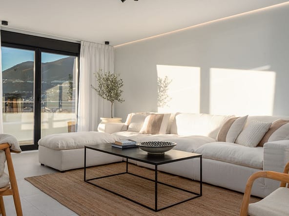 Beautiful penthouse with 2 west facing terraces in Torrequebrada. 2 bedrooms, 2 bathrooms, one of them ensuite. 2 very big private garage spaces and a spacious storage room are included in the price. Very well kept and quiet residential community, touristic rentals are not permitted. Communal garden and swimming pool. Walking distance to restaurants, cafés, supermarket, farmacy, bus stop and the beach. Neighbour with Torrequebrada Golf Club.
