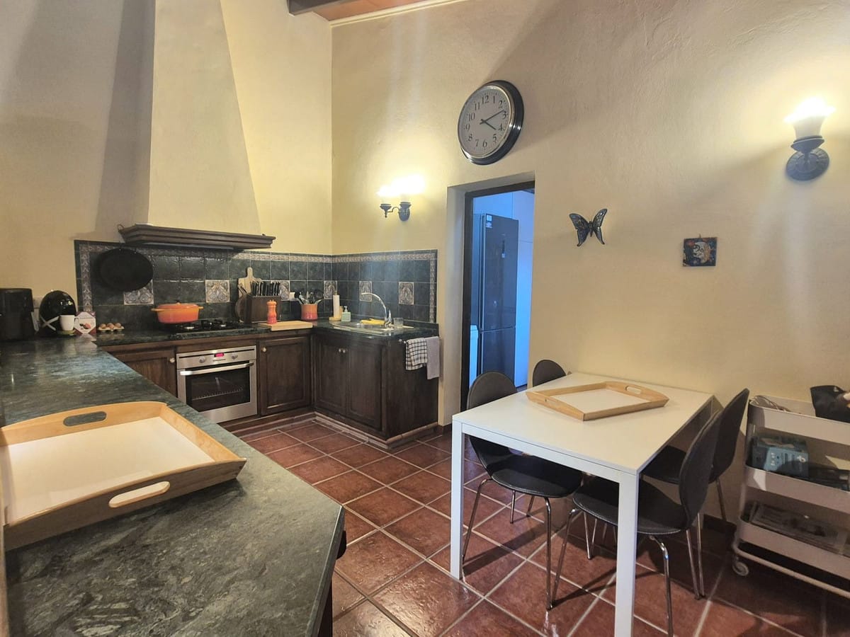 Outside in the very well maintained garden you have a good size garage with storage area, a water shed and an outside toilet, which can be converted into a full bathroom next to the covered seating area. Which could also be converted into an outside kitchen. Of course, to complete this space there is a nice swimming pool with its own water fountain and plenty of seating and lying spaces. There is many fruit trees as well as grape vines on the land, where there is a separate entrance with a large movable shed for all your tools.