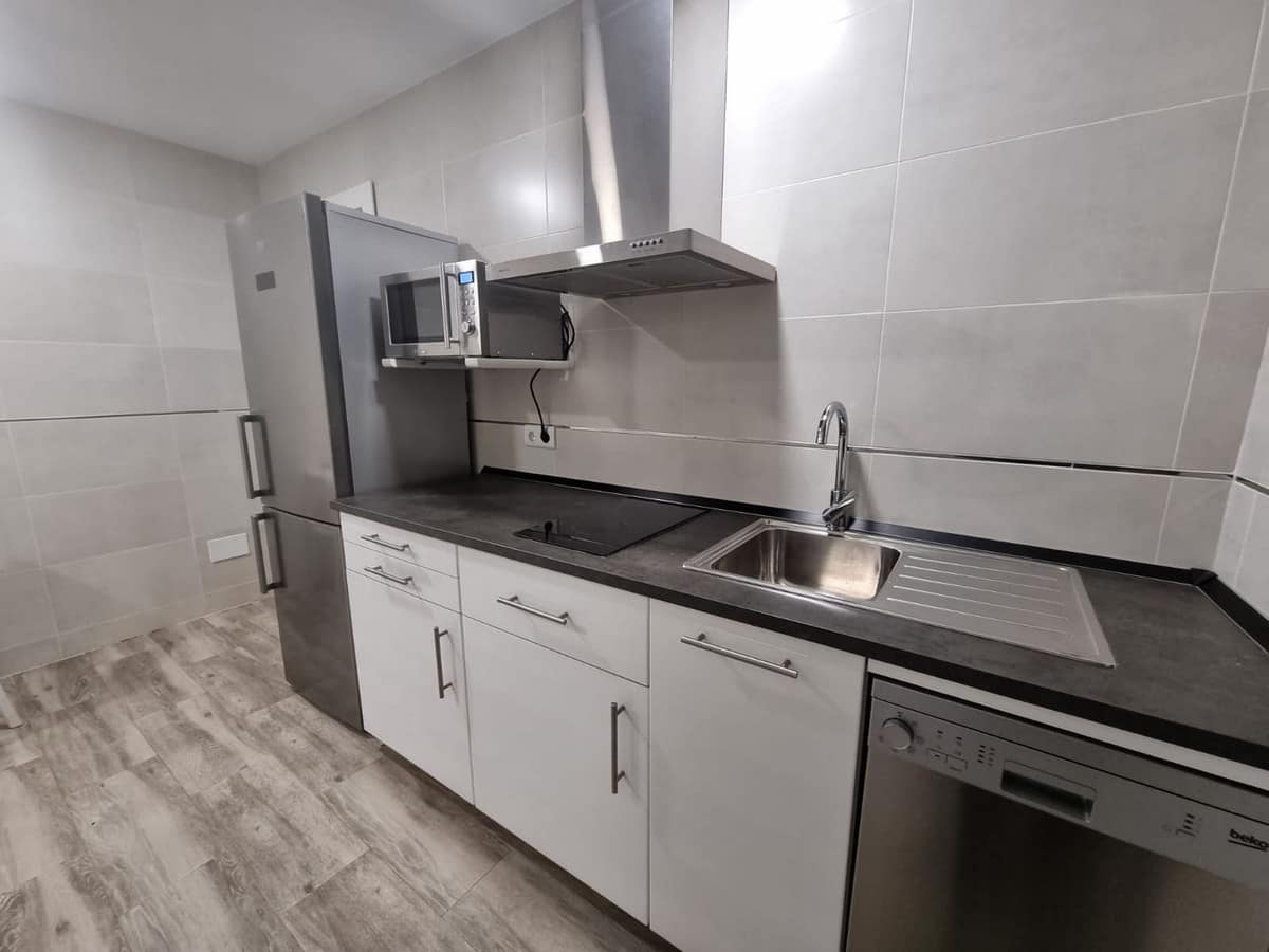 Sunlit living room with open kitchen