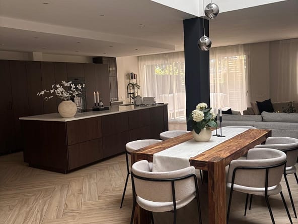 Just outside the kitchen window, a charming lemon tree adds an authentic Mediterranean touch, blending beautifully with the home’s clean Nordic design. From this level, you have direct access to a private terrace, ideal for alfresco dining, relaxing, and enjoying spectacular sunsets over the golf valley.