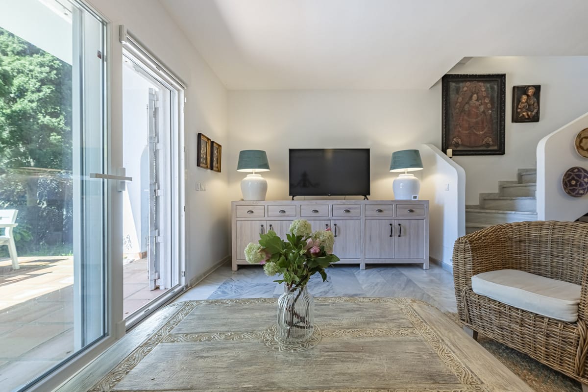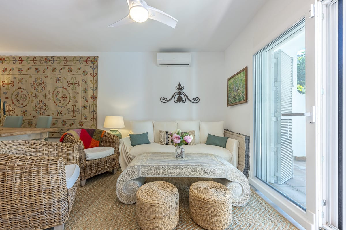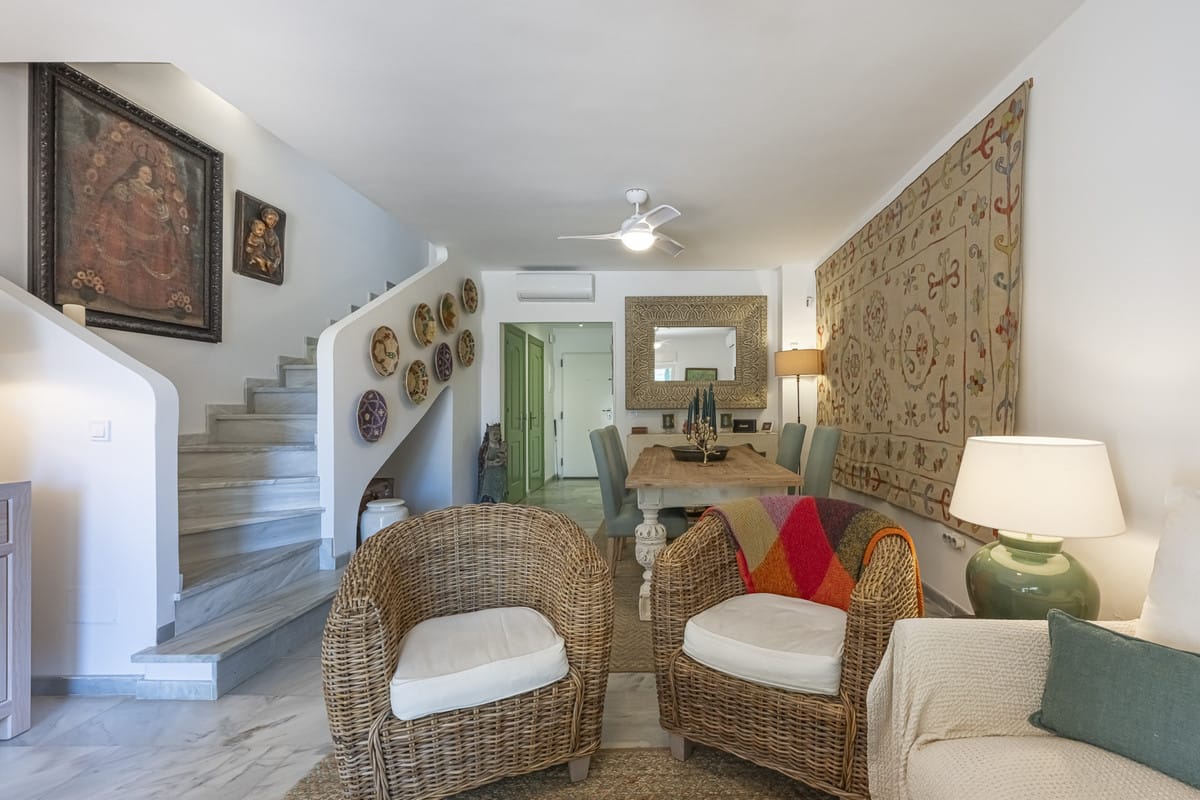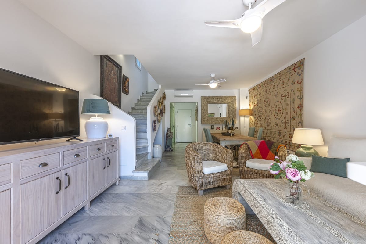 Town House for sale in Cabopino, Marbella with 2 bedrooms, 2 bathrooms, 2 en suite bathrooms and 1 toilet, with communal swimming pool and private garden. Regarding property dimensions, it has 123 m² built, 175 m² plot and 30 m² terrace. Has the following facilities amenities near, air conditioning, fireplace, guest toilet, private terrace, sea view, covered terrace, panoramic view, unfurnished, close to sea / beach, close to golf, uncovered terrace, glass doors, balcony, renovation needed and close to shops.