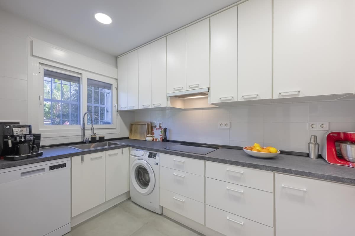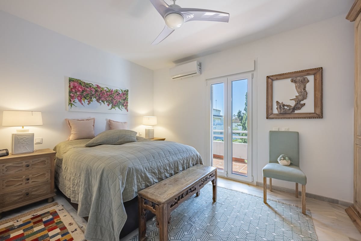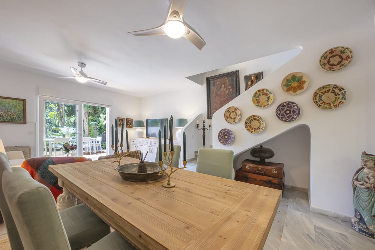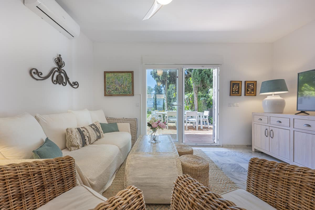 Town House for sale in Cabopino, Marbella with 2 bedrooms, 2 bathrooms, 2 en suite bathrooms and 1 toilet, with communal swimming pool and private garden. Regarding property dimensions, it has 123 m² built, 175 m² plot and 30 m² terrace. Has the following facilities amenities near, air conditioning, fireplace, guest toilet, private terrace, sea view, covered terrace, panoramic view, unfurnished, close to sea / beach, close to golf, uncovered terrace, glass doors, balcony, renovation needed and close to shops.