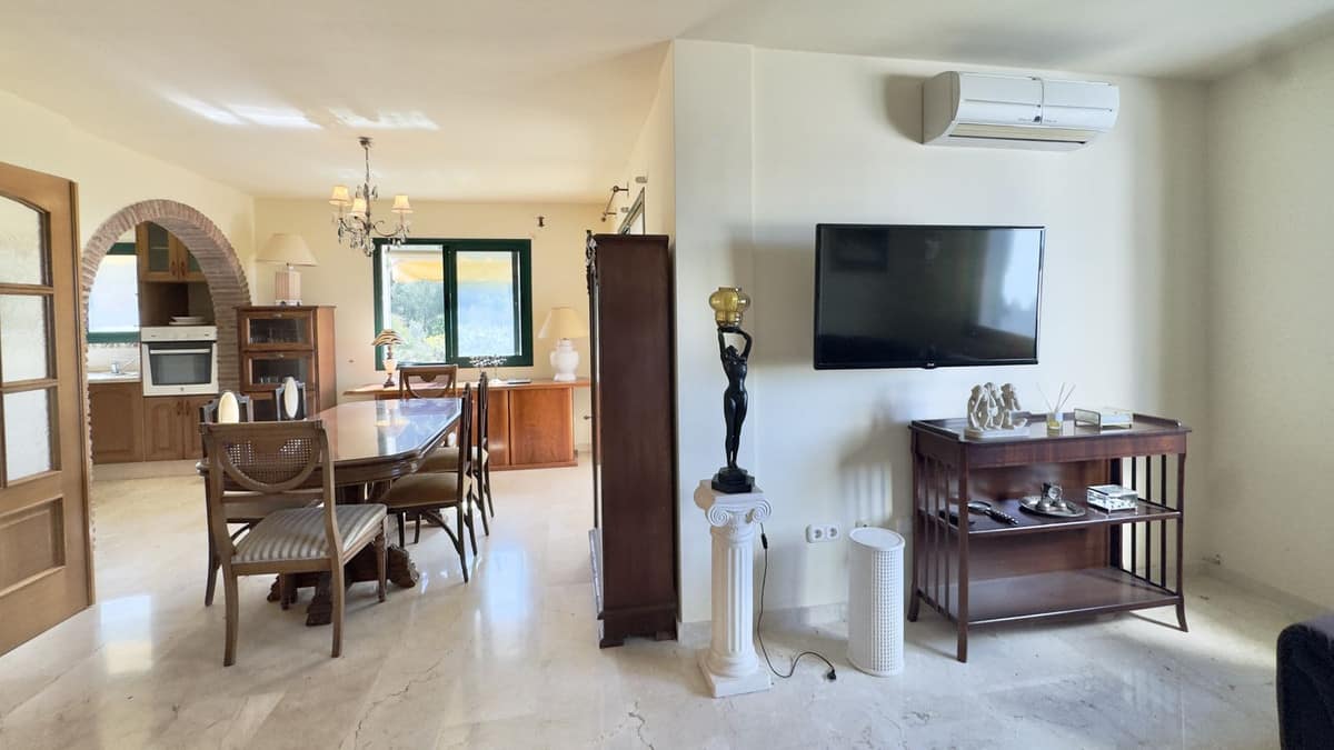 Located in the prestigious Buena Vista area of Mijas, this spacious corner townhouse offers a rare combination of panoramic views, privacy and excellent value-add potential.