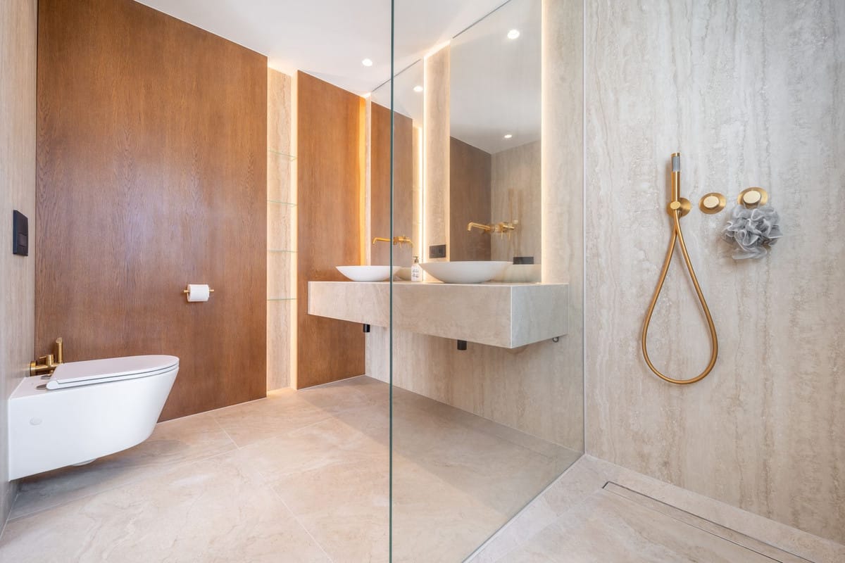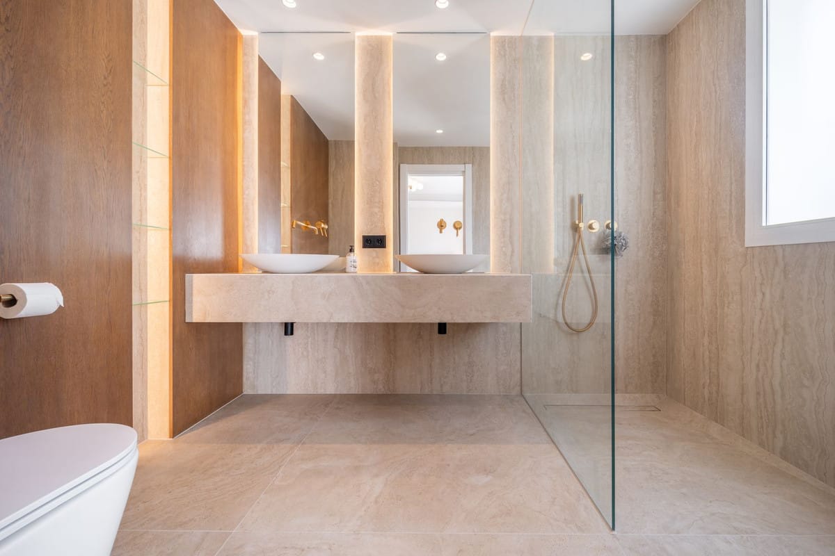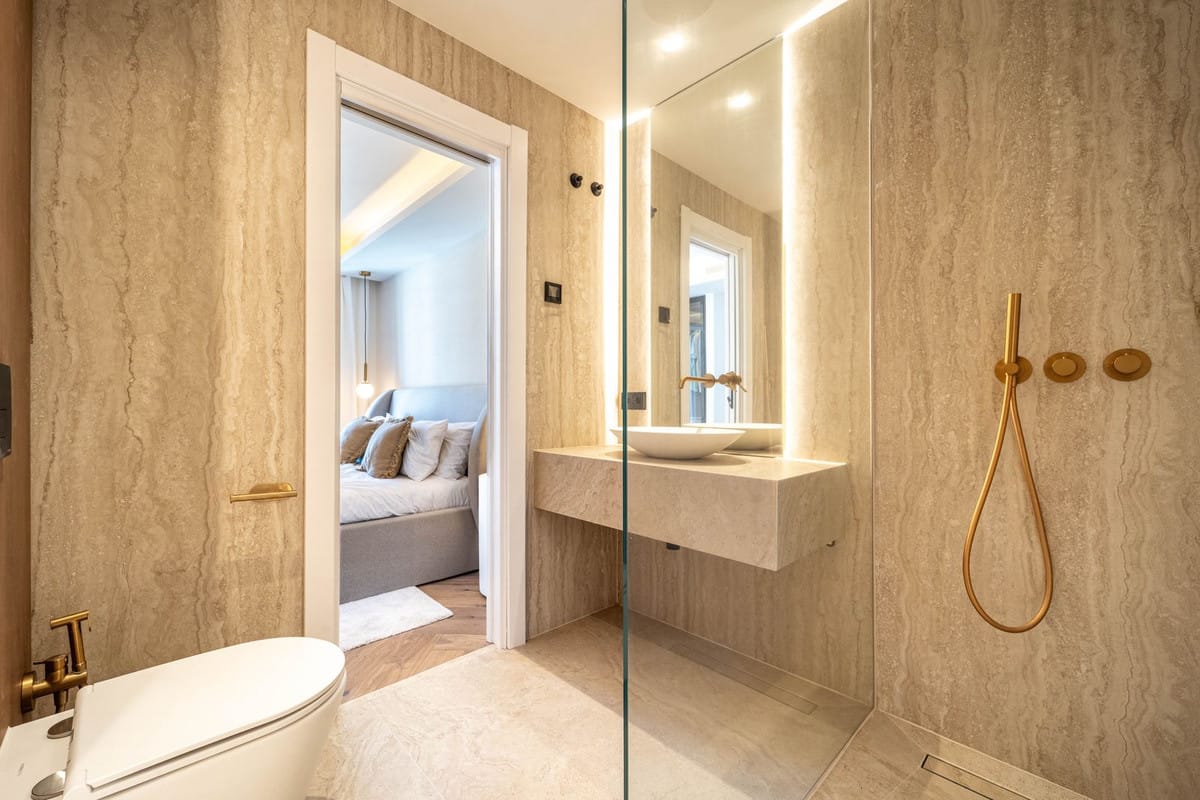 Leading into the master bedroom of the home, you have a vast master suite with a quad fitted wardrobe to match the other bedroom, it has been carefully designed to allow enough storage for a variety of clothing, including a dedicated bag display to the right hand side. This bedroom benefits from a private terrace where you can sit and look across Las Brisas golf course. The master ensuite is designed in the same high end way as the other but with added space, more solid oak panels and natural light that is let in through from the rear of the property. It has also been designed to include a separate his and hers sink upon the vanity unit.