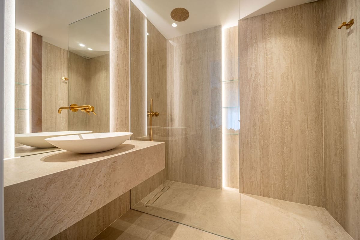 As you step upstairs into the property, you are met with a large landing comprised of the beautiful oak herringbone with bespoke bannister, to the left you will find the guest bedroom which is a very well proportioned room with custom backlit glass wardrobes featuring a linen interior to match the bedroom wallpaper. This bedroom has its own ensuite bathroom that features floor to ceiling travertine tiling, backlit niches with floating glass shelving, underfloor heating and a matching vanity unity with a full height bespoke backlit mirror.