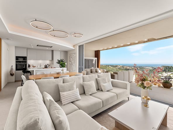 The apartment comprises of an entrance hallway, a semi-open kitchen leading into a bright and spacious living room with a separate dining area. These living spaces open onto generous terraces, perfect for enjoying both morning and afternoon sun while taking in the incredible views.