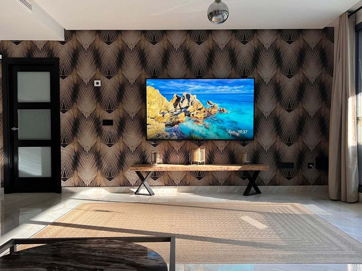 With 100 m² of interior space, it features 3 spacious bedrooms, 2 fully upgraded bathrooms with premium finishes, and a 40 m² sun-drenched terrace boasting panoramic views of the golf course and surrounding mountains. Every detail has been carefully selected, including a designer kitchen equipped with Bosch appliances, a BORA hob with integrated extractor, and a high-end countertop. The living room is elegantly finished with Cavalli wallpaper, enhancing the luxurious feel of the space.