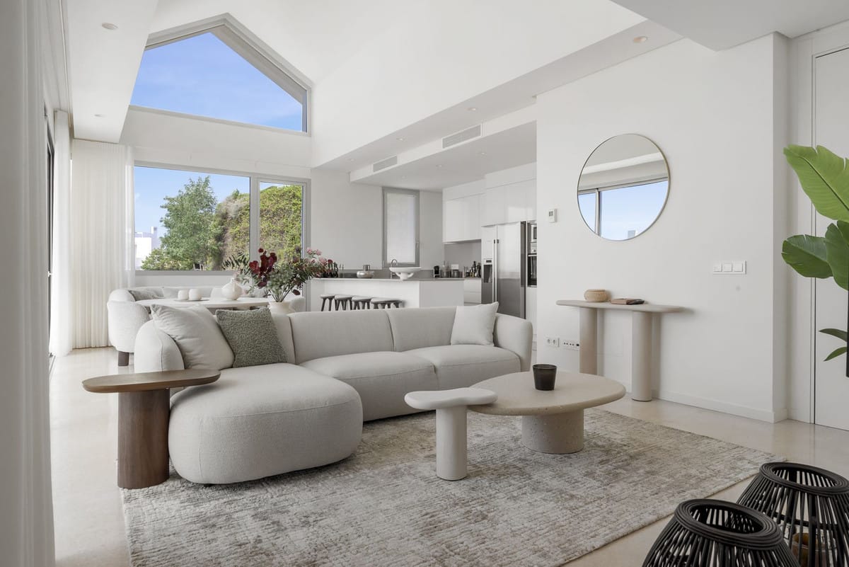 Upon entering this elegant penthouse, you are welcomed by an abundance of natural light, thanks to the large floor-to-ceiling windows and beautifully designed patio doors. These lead directly to your private terrace, where you can enjoy the serene surroundings and impressive views of the sea.