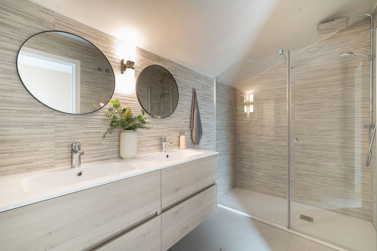 Year-round comfort is ensured by an efficient aerothermal system and water-circulating underfloor heating throughout the entire residence. These modern amenities offer superior climate control and significant energy savings compared to traditional heating methods.