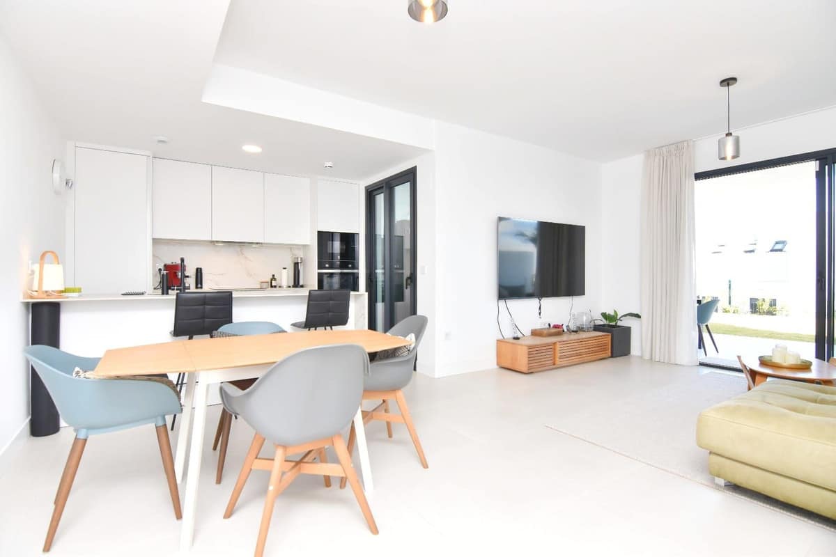 The bright living room with open-plan kitchen connects to the terrace and barbecue area – ideal for enjoying the Mediterranean climate all year round. The kitchen also features a large window with direct access to the terrace, bringing in plenty of natural light.