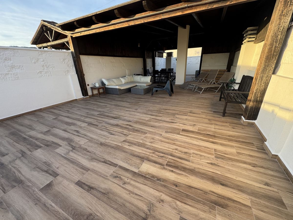 Within a gated community with a swimming pool and communal garden, the south orientation of this penthouse guarantees natural light throughout the day. Upstairs there is a large terrace perfect for gatherings with a large wooden pergola that covers half of the surface to enjoy both sun and shade.