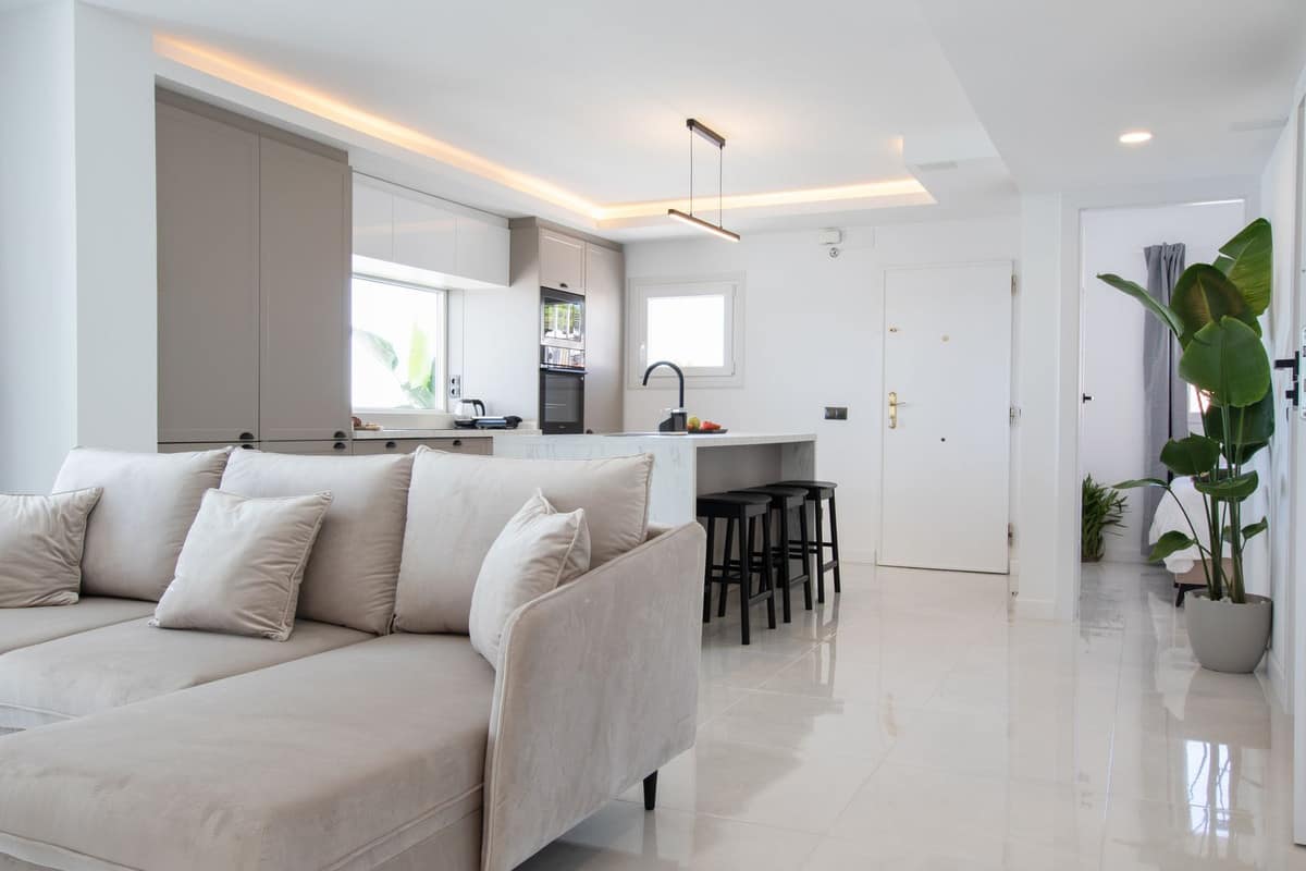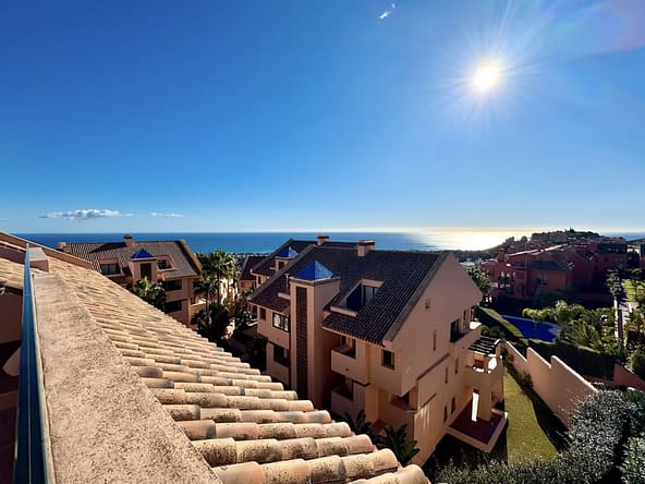 The apartment is a corner penthouse on the beachfront in Calahonda, Mijas Costa, province of Málaga. Completely renovated, without leaving a single detail to chance, the apartment has a large open kitchen, more than 4 meters long and with a large island. All appliances are new, there is a washing machine, dryer, dishwasher, refrigerator, induction hob, microwave, toaster, blender, coffee maker, etc. Fully stocked with a large selection of plates, bowls, glasses, mugs, etc. The kitchen has a lot of light since it has 2 windows, both with views of the sea and the beach. The living room is large and square, with an L-shaped sofa bed, smart TV, sea views from many angles and a door leading to the private terrace. On the terrace of more than 60 m2 there is a covered part, with a large table and 6 chairs, hot and cold air conditioning (split), and the other part of the terrace is without a roof, with a barbecue, sun loungers. and beautiful views of the sea, facing east, south and west.