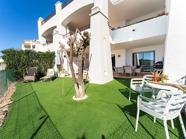 The complex features a communal swimming pool, landscaped gardens, and a peaceful location close to the beach and renowned golf courses. Built to high standards, it includes marble floors, air conditioning, a lift, and double glazing.