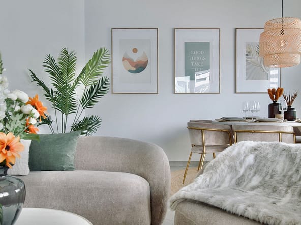 The residence offers three spacious bedrooms and three bathrooms, including a well-appointed master suite that provides privacy and comfort. The open-plan living and dining area is bright and welcoming, complemented by a fully equipped contemporary kitchen. High-quality finishes are present throughout the property, including marble flooring, air conditioning, and carefully selected materials that reflect understated elegance.