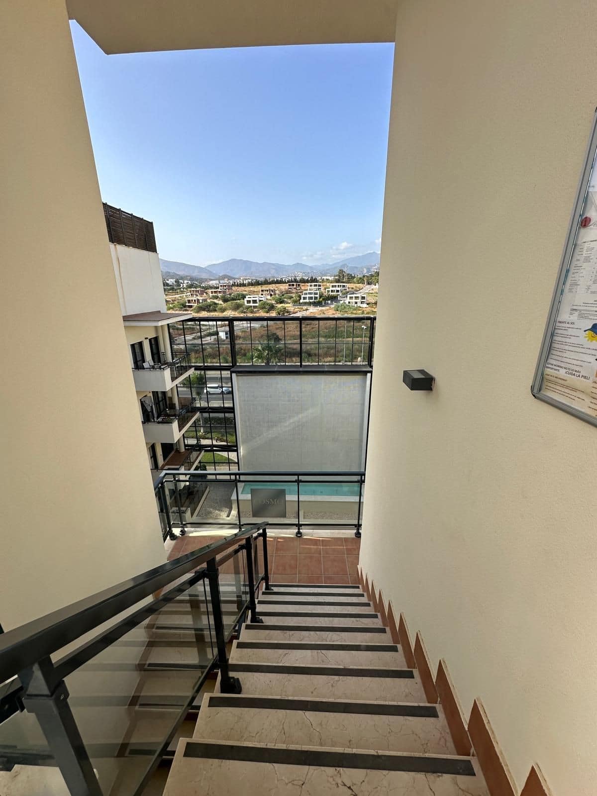“The apartment is located west of Marbella on the “New Golden Mile” few minutes from the lively marina of Puerto Banus and the more traditional town and beaches of Estepona. The building has a beautiful roof top infinity pool with views across to Africa. Close to all amenites and surrounded by 5 star resorts and public transport, this southwest beautiful ground floor apartment consists of a bright living and dining area with access to the terrace and the private garden. Three bedrooms with built-in wardrobes and two bathrooms, one en-suite. Fully equipped kitchen and laundry room. The apartment comes with an underground parking and storage room. Security in the compound, solar panels and only few steps to the beach and coastal walkway.”
