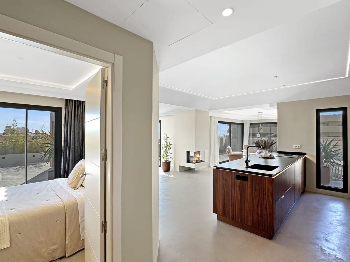 The open-plan layout is the heart of this penthouse. The indoor living space is 135 square meters, featuring a seamless flow between the lounge, dining area, and the stunning kitchen. The kitchen boasts elegant walnut finishes, a composite countertop, fully integrated appliances, and a central kitchen island with an induction cooktop. A cozy fireplace is strategically placed to create a warm and romantic feeling in the open living area on late evenings.