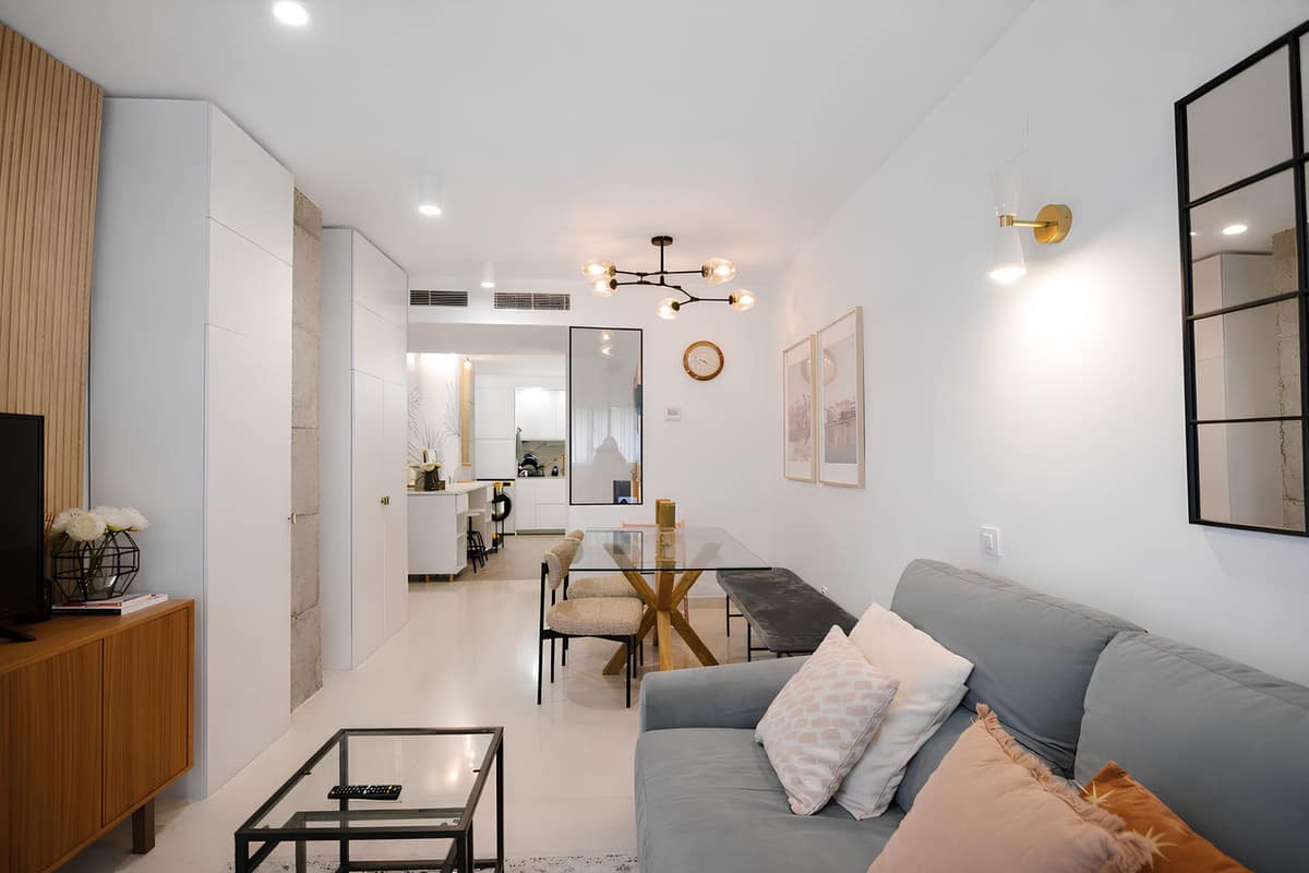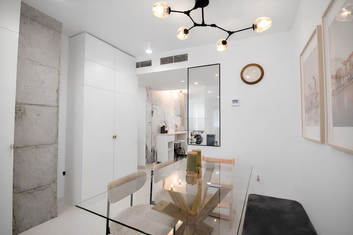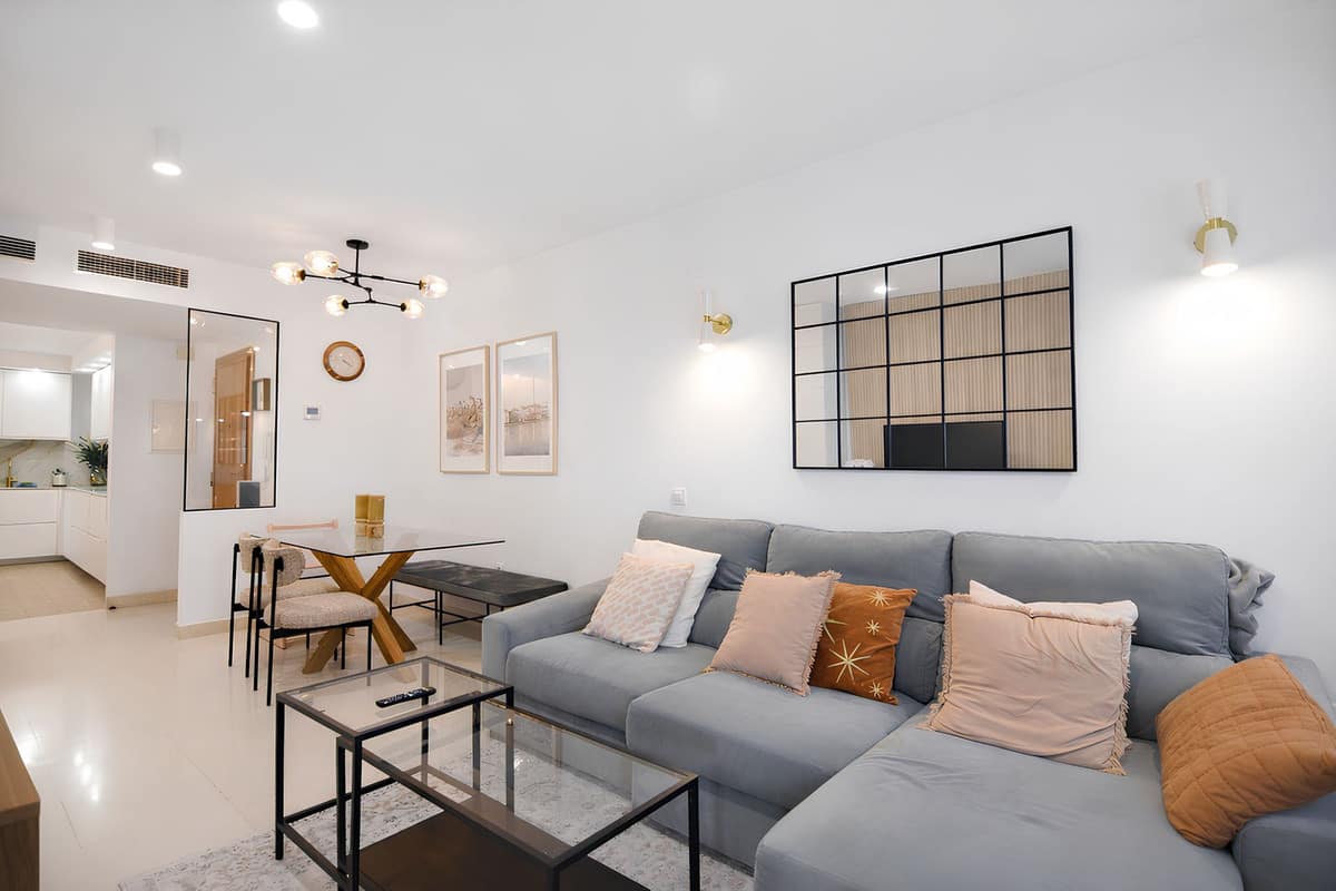 Spacious living dining room with direct access to a southeast facing terrace, perfect for enjoying the morning sun and pleasant sea views