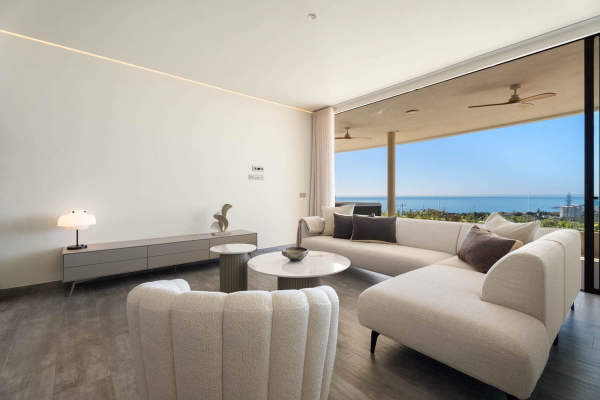 Situaded within a secure residential enclave in El Higuerón, this brand-new three-bedroom corner apartment offers refined contemporary living with open sea and valley views.