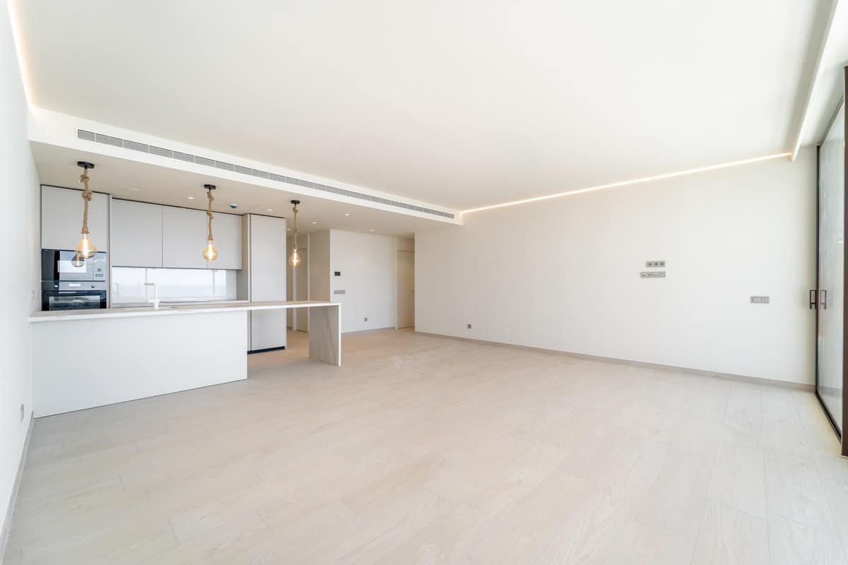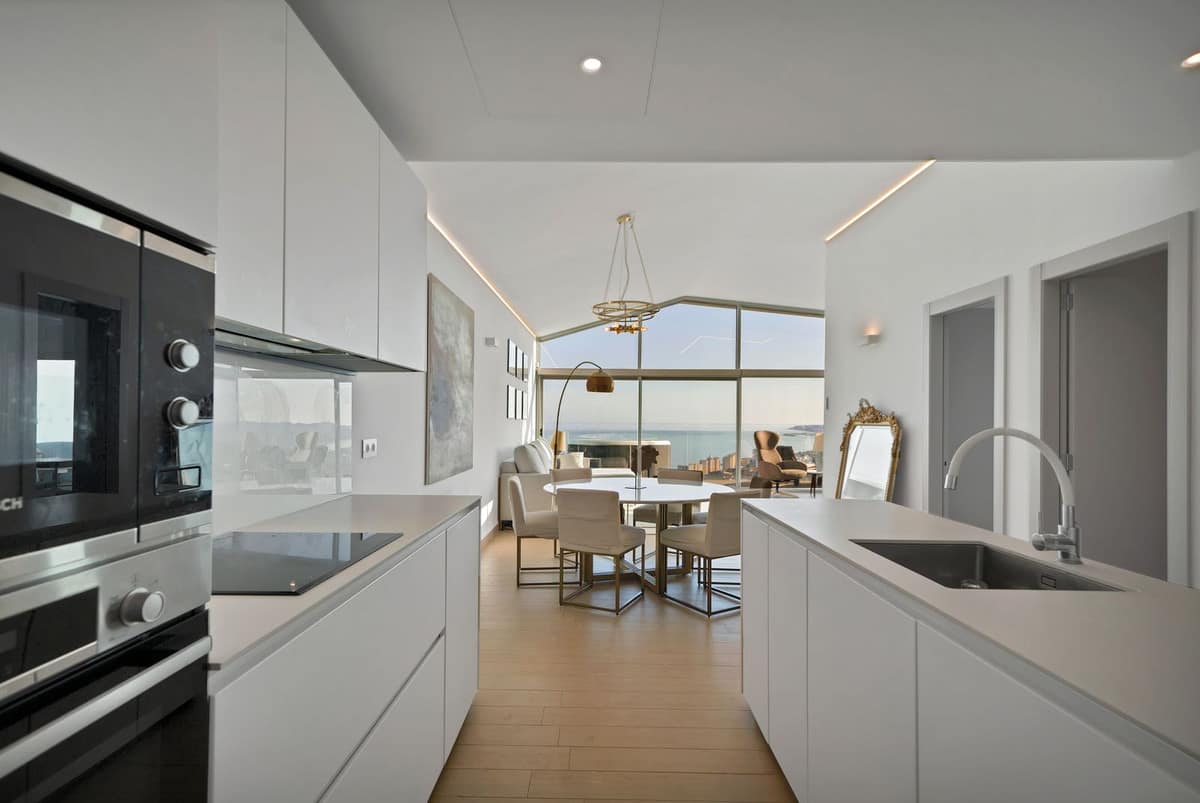 This spectacular penthouse in Residential Med One redefines luxury coastal living. Positioned just 500 metres from the beach, it offers panoramic, uninterrupted views of the Mediterranean from every angle. The bright, open-plan living area is framed by floor-to-ceiling windows, filling the home with natural light. A sleek, open concept kitchen flows seamlessly into the lounge, ideal for both entertaining and everyday living. With a recently added decalcifier system, this home offers enhanced water quality and an extra touch of luxury. The property features three spacious bedrooms with fitted wardrobes and two elegant bathrooms. The master suite boasts a private en-suite complete with a freestanding bathtub, a separate shower, and spectacular views over the Mediterranean. The 44 m² terrace, with both covered and open areas, includes a hot tub; the perfect place to relax, dine, and take in breath taking sunsets. Two parking spaces and a storage room are included.