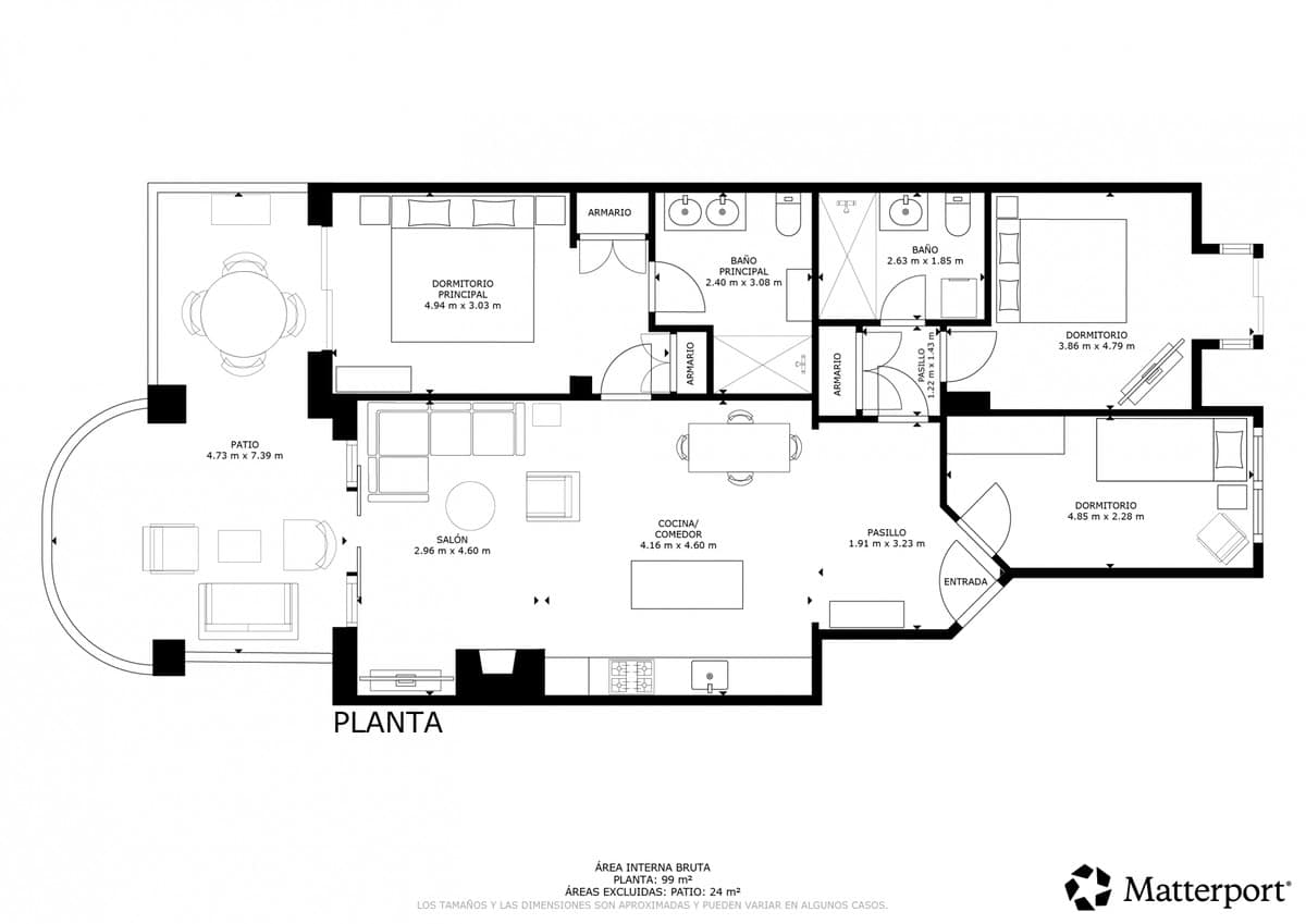 The living room features a fireplace, perfect for the cooler months, as well as air conditioning with heat pump (hot & cold). From both the living room and the master bedroom there is access to a lovely covered terrace, ideal for year-round enjoyment, with direct access to one of the quietest swimming pools in the complex.