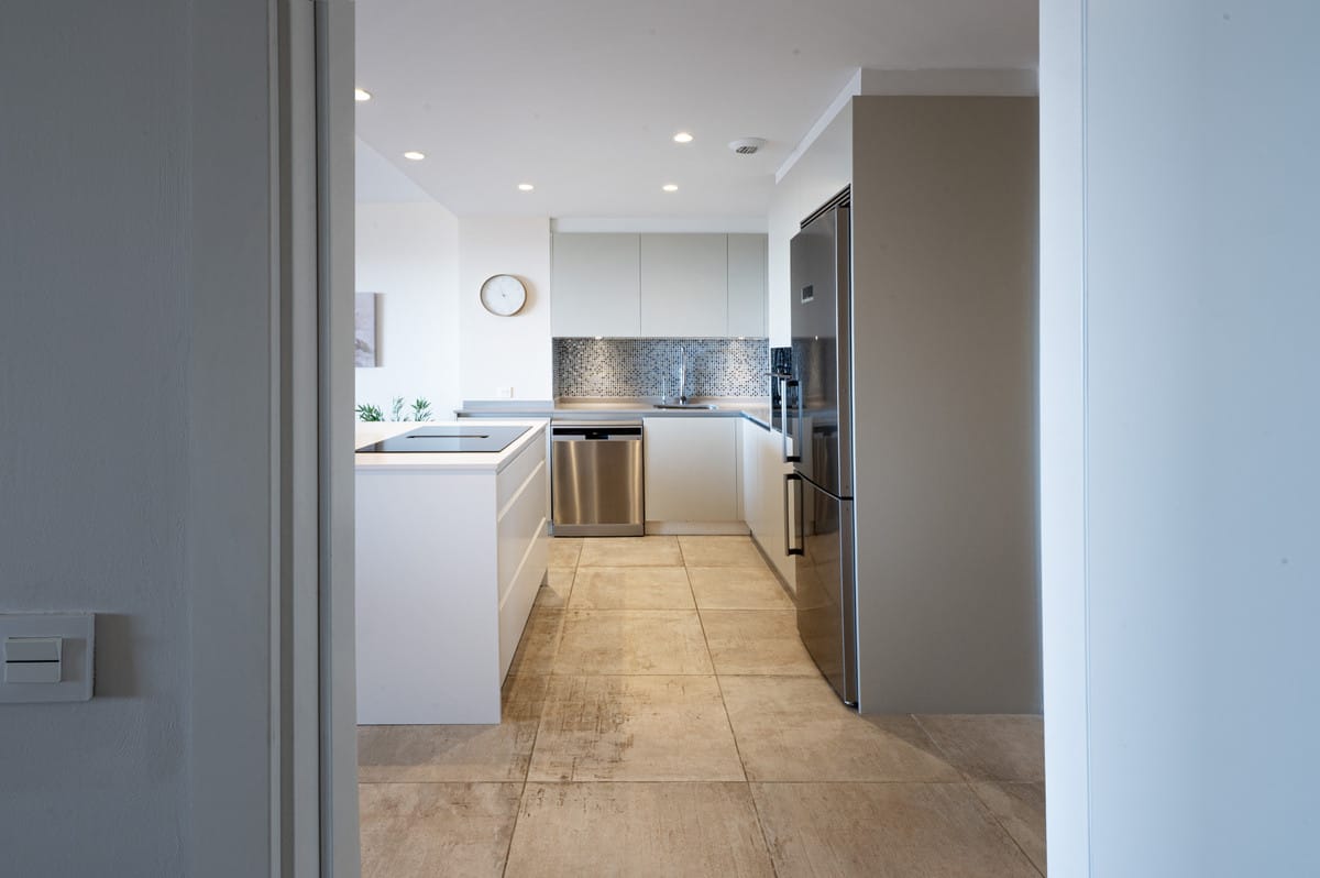 Upon entering the property, you will find two bedrooms with built-in wardrobes and a bathroom located at the rear of the apartment. Both bedrooms have access to a smaller terrace. At the front is the living room with the elegant open kitchen. From here, you have direct access to the spacious terrace through beautiful sliding doors that disappear into the wall, creating a perfect flow between the interior and exterior.