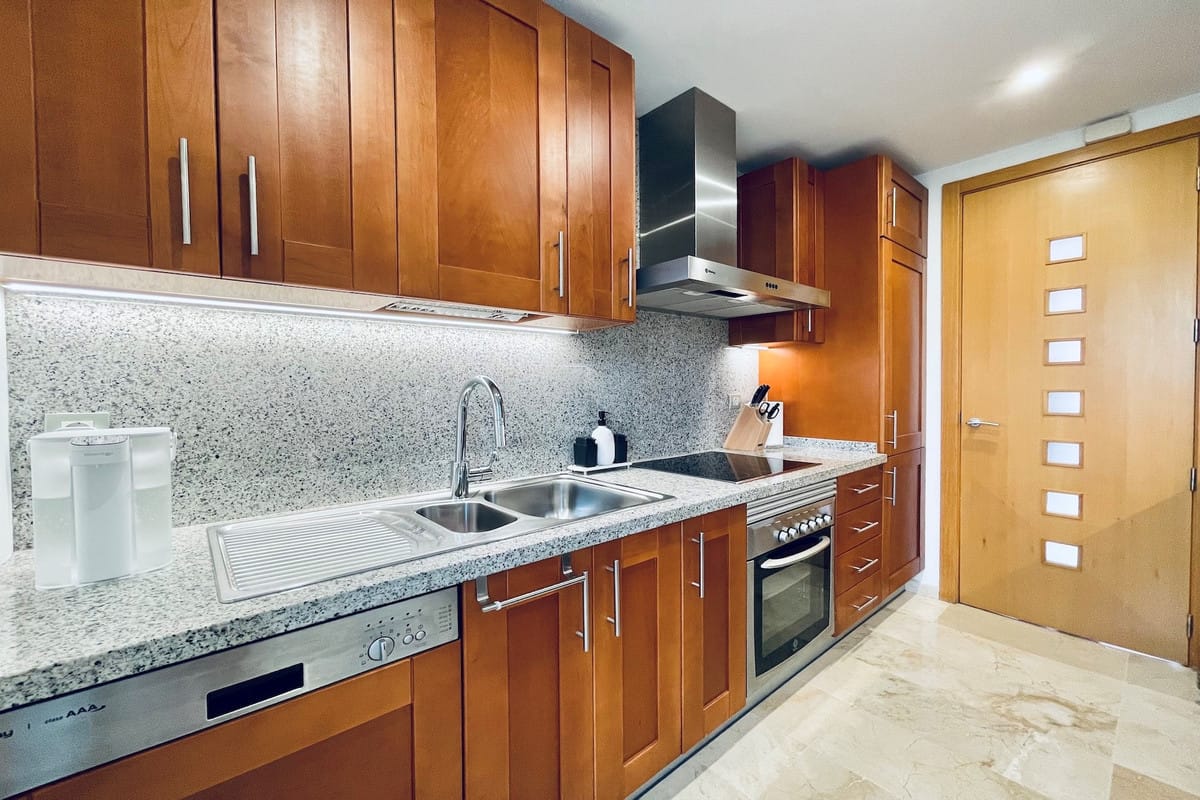 This modern corner garden apartment for sale offers near idilic modern luxury living and gives the feeling of living in a new build one level villa. High quality build with modern open plan layout and beautifully decorated throughout. Entrance hall with luxury wallpaper and wood panelling in parts, leading onto main living area and all bedrooms and bathrooms.