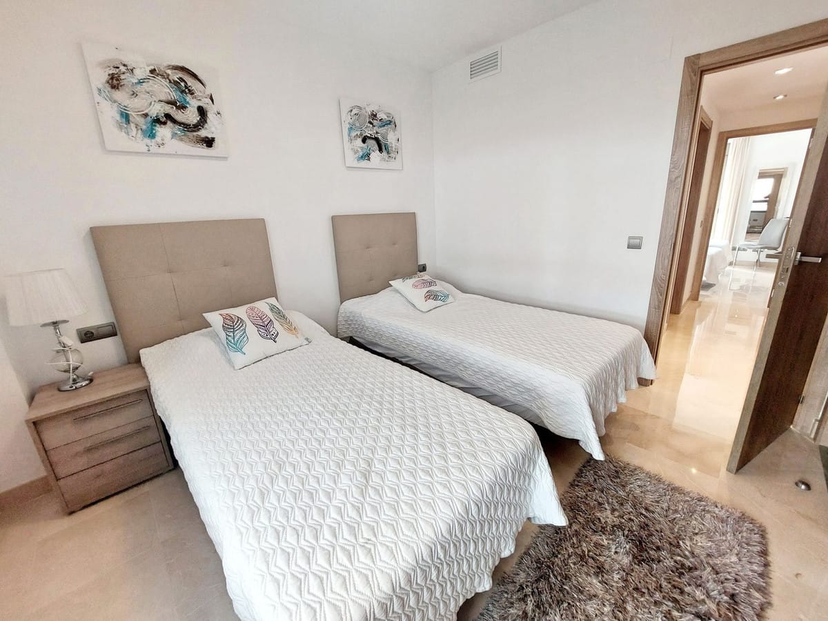 A beautiful staircase with glass balustrades lead you upstairs to the upper terrace and the master suite which consists of a large master bedroom with fitted wardrobes and an elegant 2 tone bathroom with a walk in shower. The terrace on this level is genuinely stunning with all day sunshine and panoramic views to the golf and mountains. Enjoy the views from the sunbeds and stylish outdoor seating furniture and this is a terrace to genuinely enjoy yourself. The entire penthouse is sold fully furnished in an elegant and contemporary style so you simply need to enter and move in immediately and enjoy the Spanish lifestyle. There are swimming pools and community gardens to enjoy and you also have 2 garage spaces and a storage room included in the price which is right below the penthouse.