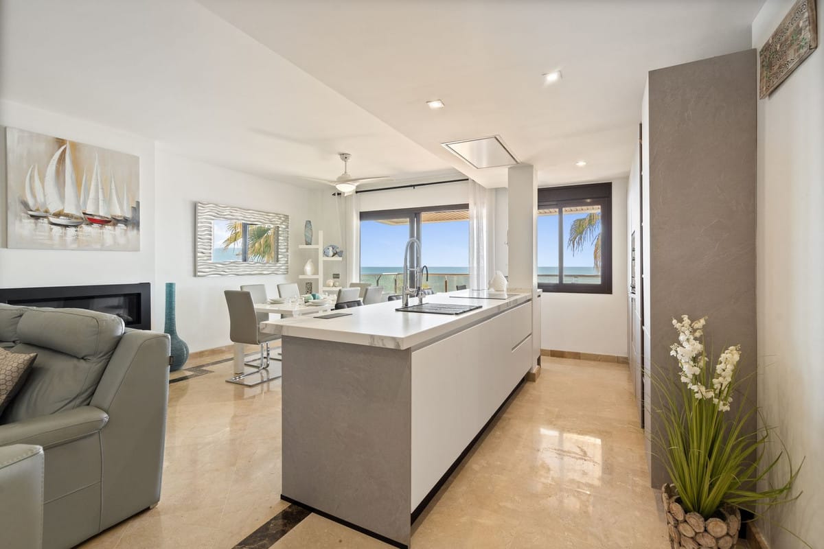 Fantastic first-floor apartment in one of Manilva’s most exclusive beachfront complexes, Los Granados de Duquesa. It offers three spacious bedrooms and two bathrooms. The master bedroom has an en-suite bathroom and direct access to a terrace with sea views, while the second bedroom enjoys another southwest-facing terrace that brings plenty of natural light. The property also features direct access to the beach and promenade, 24-hour security with video intercom and CCTV, as well as individual air conditioning in every room. The community offers a swimming pool and tropical gardens, and the apartment includes a private underground parking space. Just a short walk from La Duquesa marina, this is a unique opportunity to enjoy the Mediterranean lifestyle in an unbeatable location.