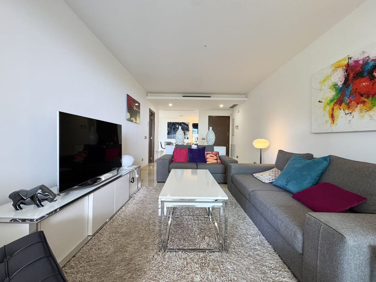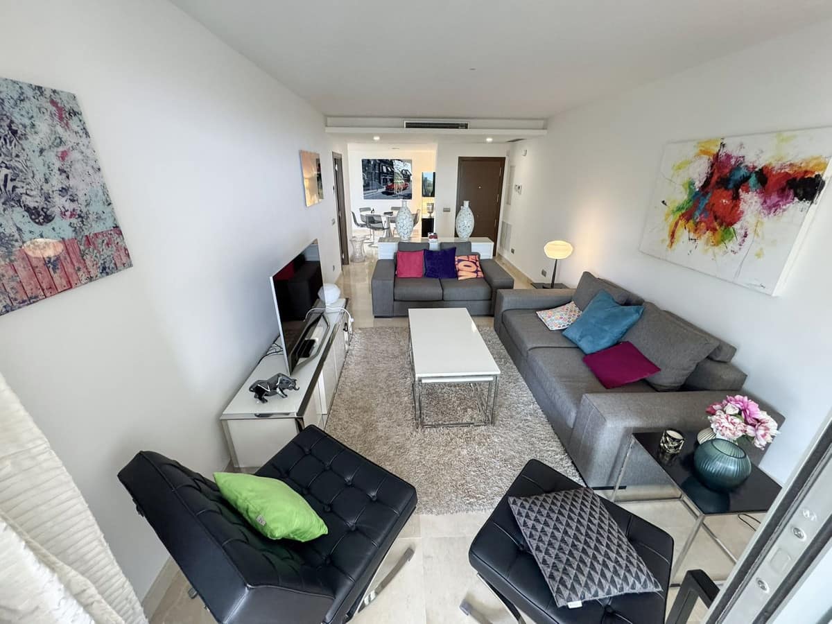 This penthouse, situated on the top floor, is accessible via an elegant entrance hallway that leads into a large, square living room. This expansive space includes both dining and sitting areas, complemented by a charming open fireplace. Direct access to the generous terrace enhances the living area, offering the perfect space for relaxation and al fresco dining, all while enjoying those captivating coastal views.