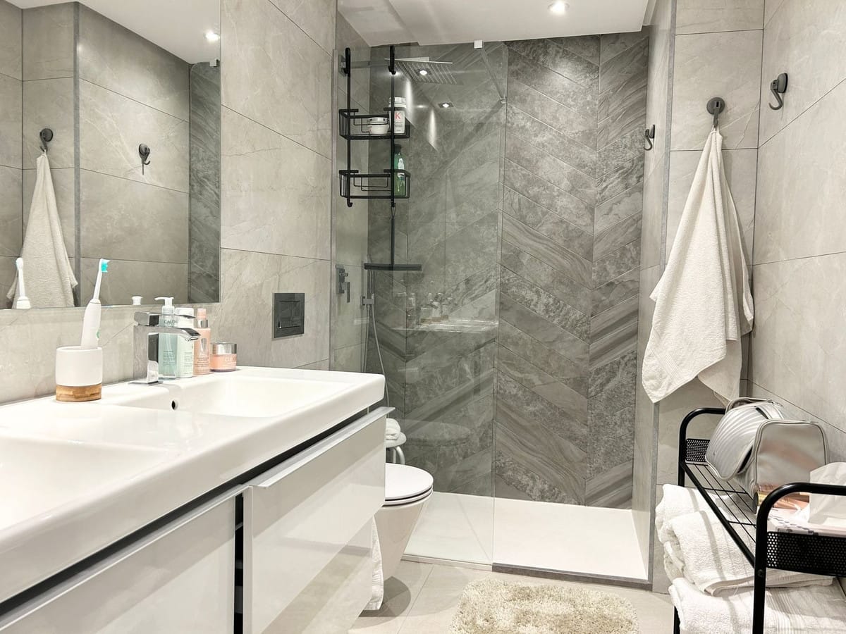 A second well-sized bedroom comes with its own stylish en-suite bathroom. The third bedroom is equally spacious and shares the beautifully appointed main bathroom, which includes underfloor heating for ultimate comfort. Throughout the penthouse, enjoy the ease of a smart AC system, ensuring perfect climate control year-round, and underfloor heating in all bathrooms for an added touch of luxury.