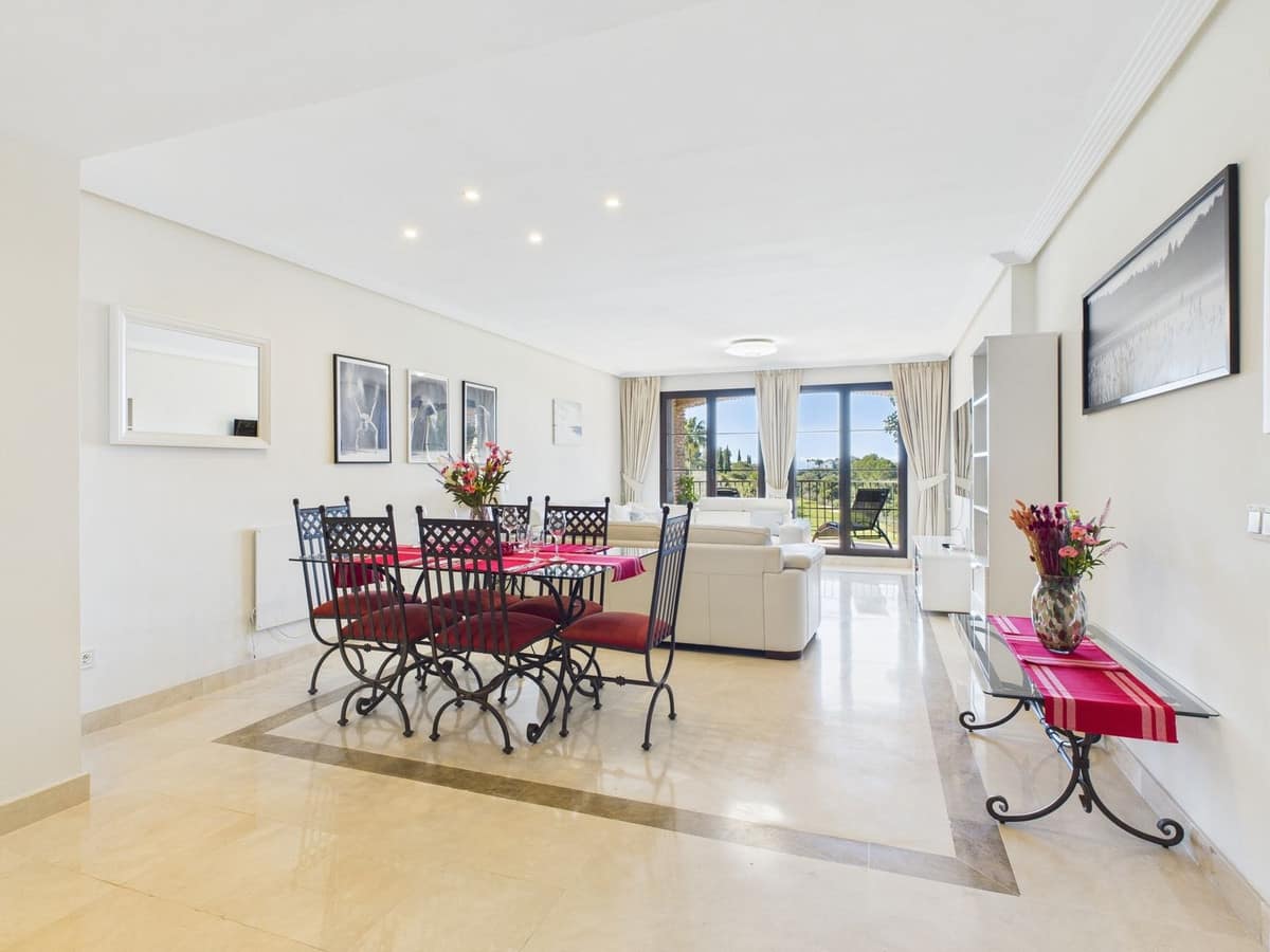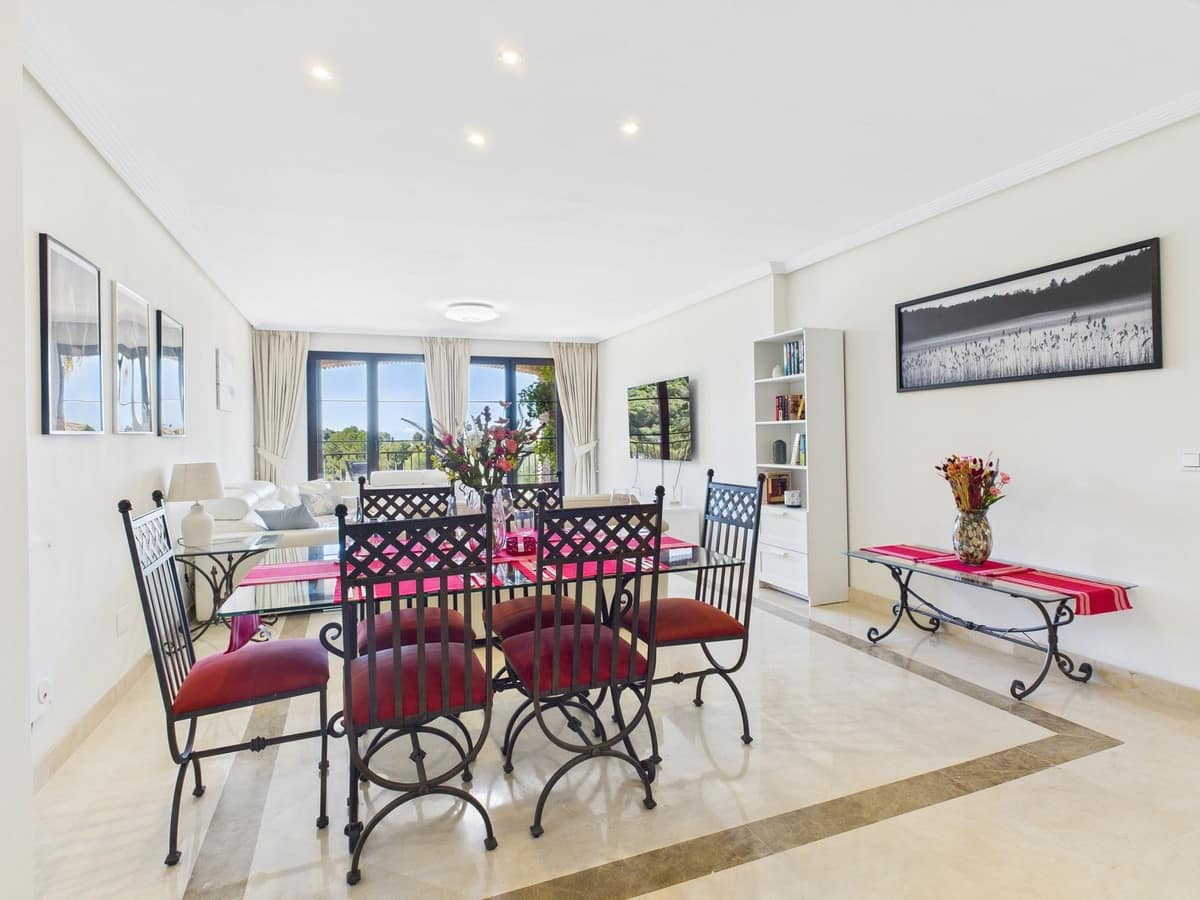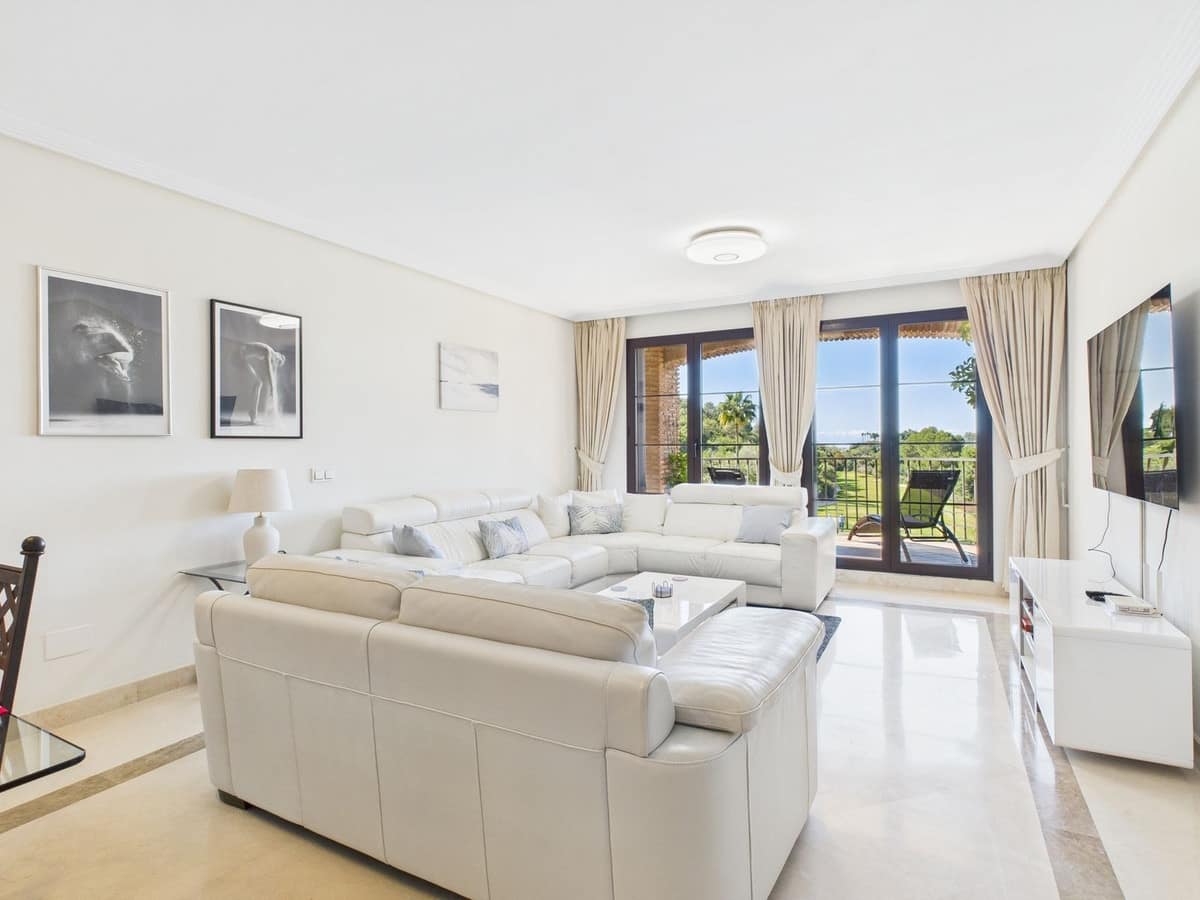 The apartment is presented in excellent condition, with a smart layout that maximises both light and space. The bright open-plan living and dining area flows seamlessly onto a generous 30 m² private terrace, creating an ideal space for relaxing, entertaining or simply enjoying the peaceful golf and garden views. Warm wood flooring and quality finishes add a sense of contemporary elegance, while double glazing and hot and cold air conditioning ensure year-round comfort. The fully fitted kitchen is both stylish and practical, offering ample storage and worktop space as well as a separate utility room.