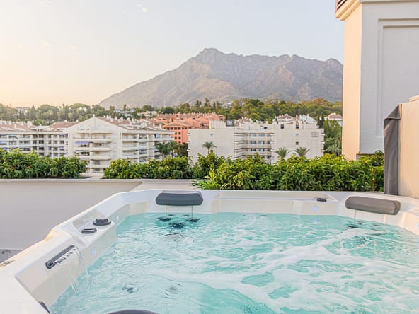 Elevate your lifestyle in this exquisite duplex penthouse, nestled in the highly sought-after El Dorado urbanization in Nueva Andalucía – a true epitome of modern Scandinavian elegance and comfort. Spanning 135 m² across two floors on the 3rd level, this fully furnished property boasts 3 bedrooms and 3 bathrooms, designed for seamless luxury living with a proven rental track record, including a valid First Occupation License (LPO) and active tourist license.