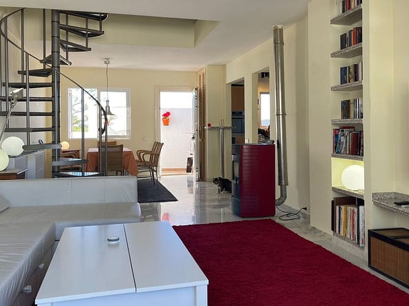 The upper floor is equally captivating, with two en-suite bedrooms: the master suite complete with a walk-in closet and access to a private terrace featuring a heated plunge pool and breathtaking panoramic sea views. The second bedroom offers a west-facing terrace with serene mountain vistas, perfect for afternoon unwinding.