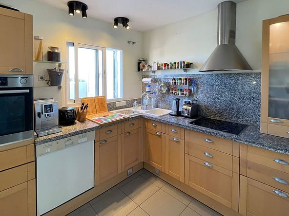 The main floor features a bright open-concept kitchen equipped with top-of-the-line appliances, flowing effortlessly into a spacious living area that opens onto a south-facing terrace. This outdoor haven includes a dining table, high bar, and barbecue zone, all overlooking the expansive communal pool.