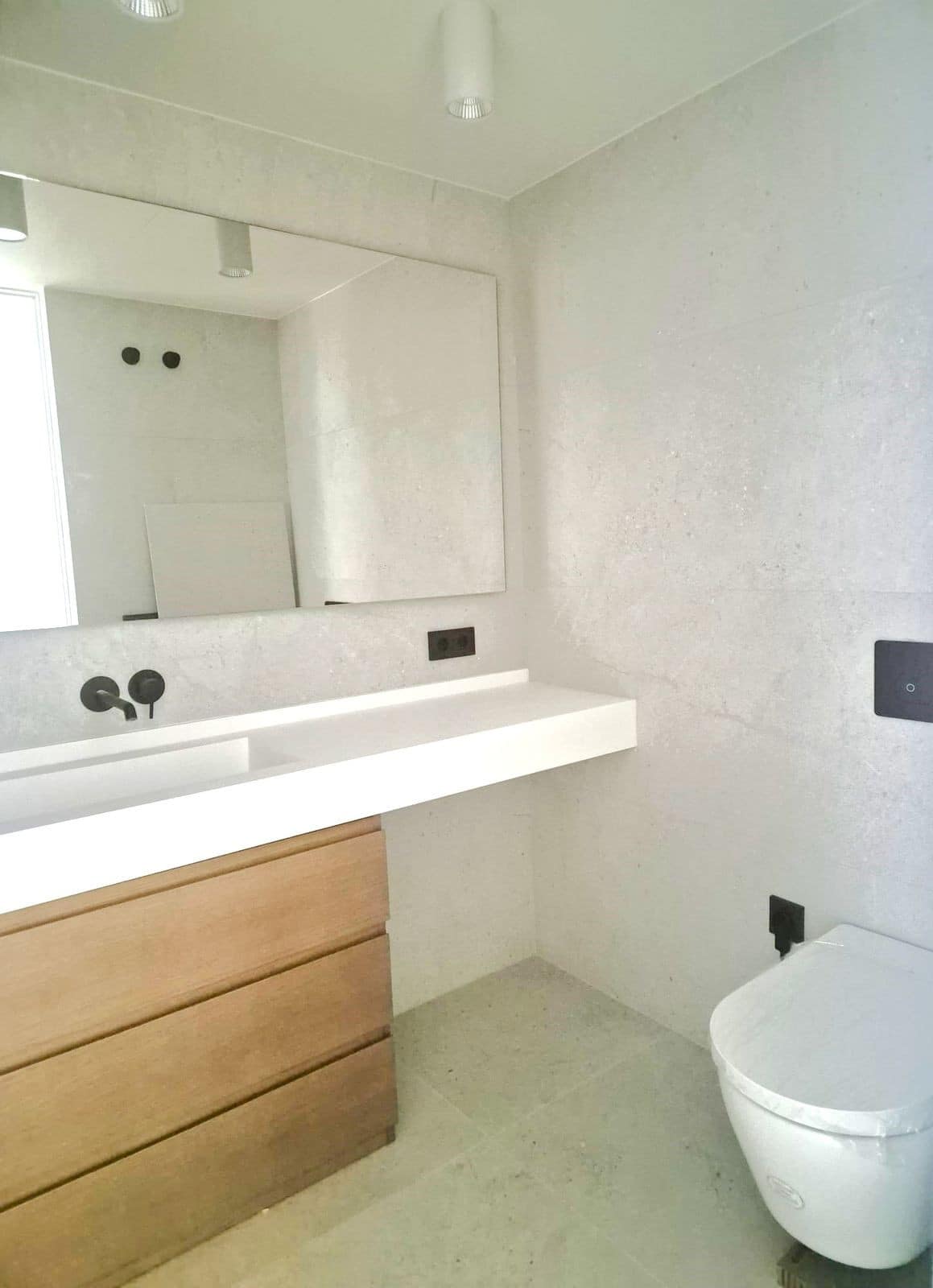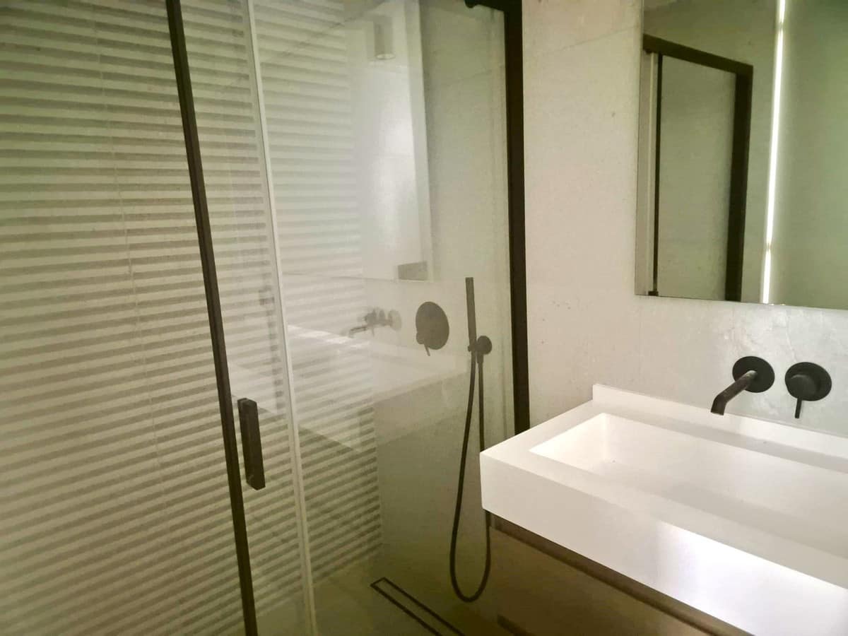 Bathrooms with wall-hung sanitary fixtures, black built-in faucets, and walk-in showers integrated into the floor.