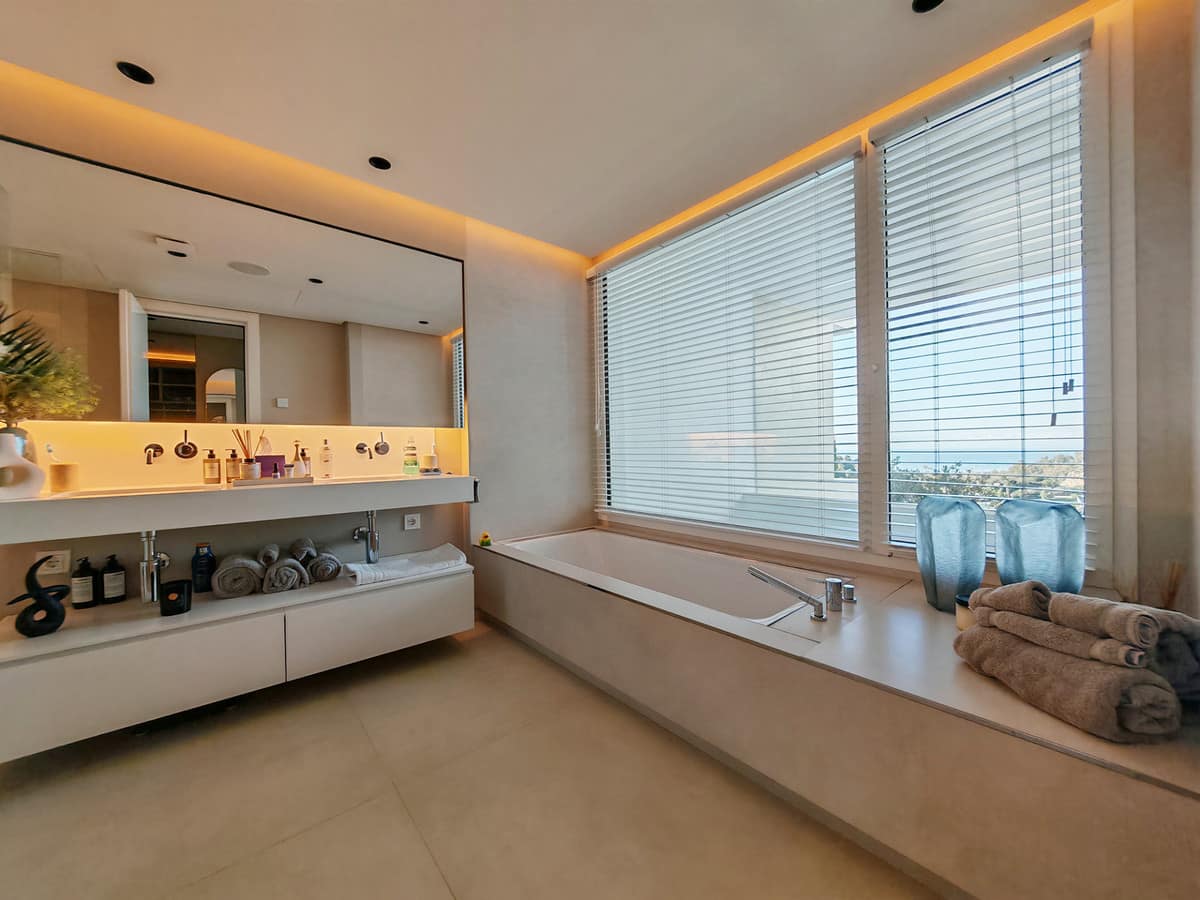 • Master bedroom: with en-suite bathroom featuring a bathtub, separate shower, double washbasin, and toilet. This room provides direct access to the terrace and stunning sea views.