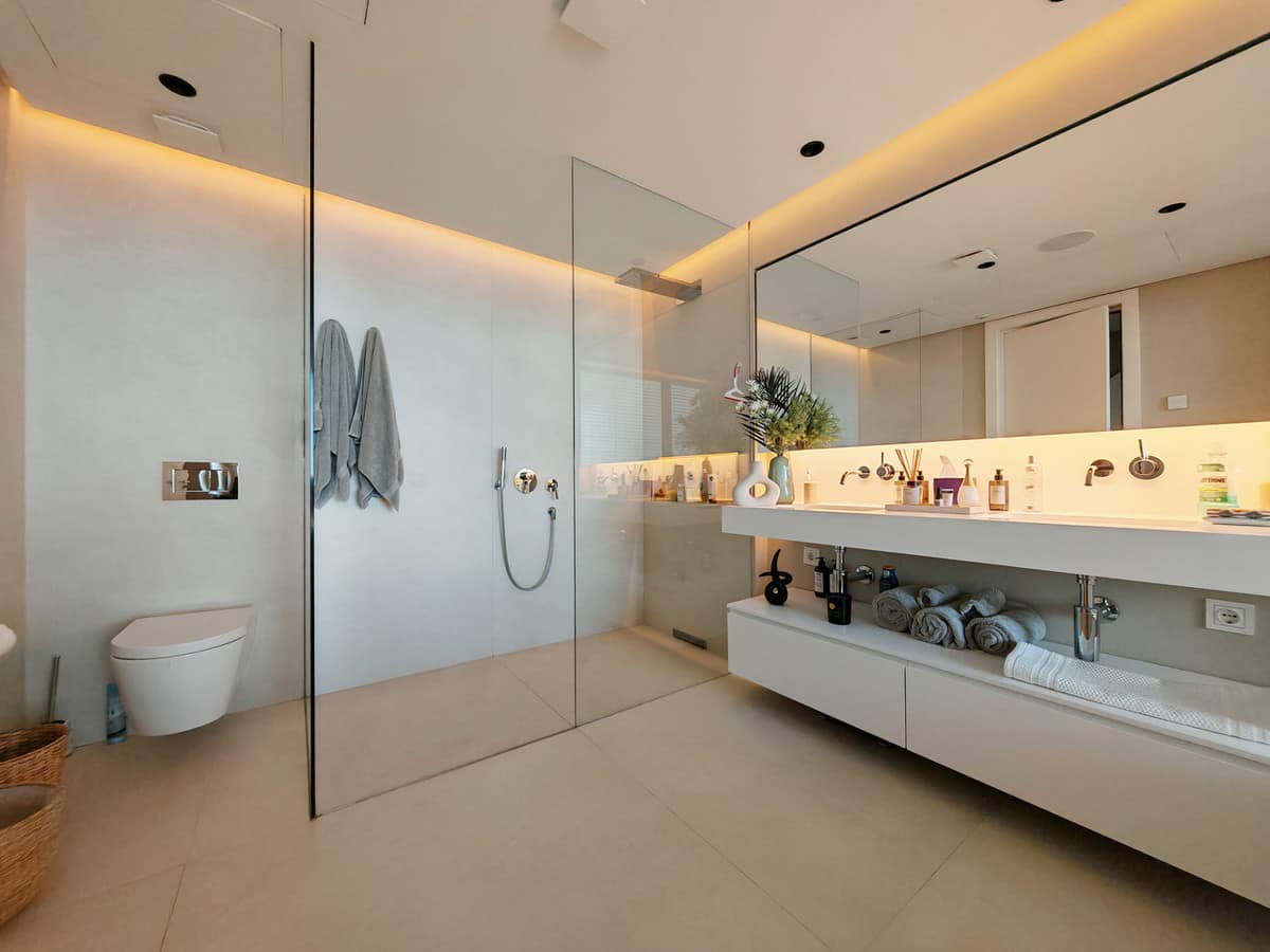 The terrace extends across the full width of the apartment, faces southwest, and offers spectacular views of the sea, the mountains, and the beautifully landscaped gardens. In the evenings, the coastal lights create a particularly pleasant ambiance. The terrace features an automatic sun awning.