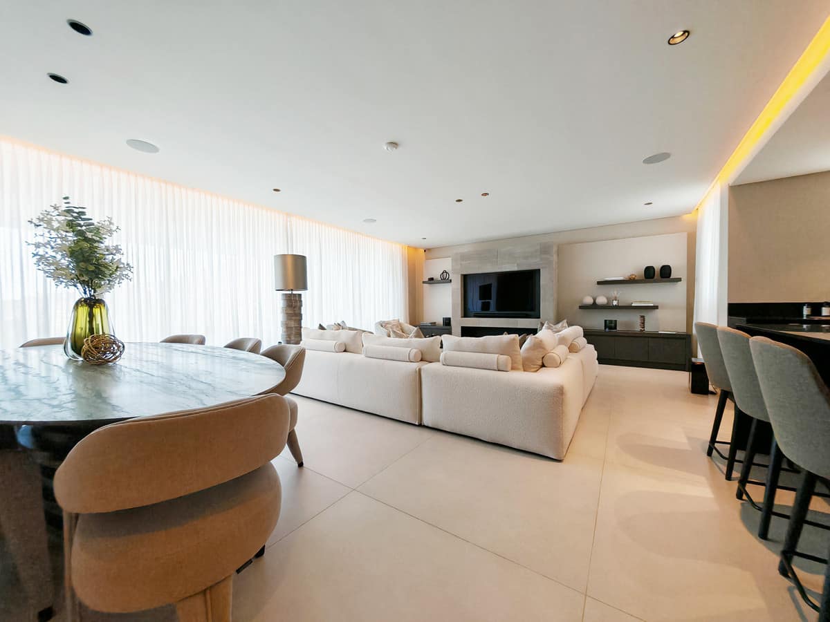 The apartment is sold fully furnished and decorated both indoors and outdoors with high-quality furniture, including pieces from the brand Eichholtz.