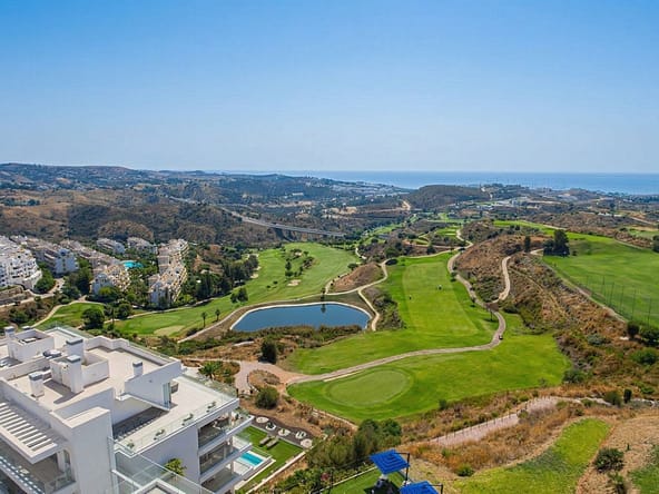 This contemporary penthouse in Mijas, Málaga, offers a harmonious blend of comfort and style. It is located directly on a golf course and offers an impressive view of the sea, so you can enjoy both the tranquillity of the green and the panorama of the coast. The open-plan living area features floor-to-ceiling windows that flood the space with natural light and provide stunning panoramic views of the surrounding landscape. The living room is tastefully furnished with a plush white sectional sofa, accented by vibrant area rugs that add warmth to the polished floors. The sleek kitchen boasts modern navy cabinetry contrasted with white countertops and high-end stainless steel appliances, creating a sophisticated culinary space. The penthouse's three bathrooms are elegantly appointed, with one showcasing a floating double vanity in rich wood tones and a glass-enclosed shower. The primary bedroom is a serene retreat with direct access to a private terrace. It features a canopied bed, a spacious walk-in closet, and a luxurious en-suite bathroom with both a bathtub and a shower. The second bedroom offers equally impressive views and is furnished with a comfortable double bed. A dedicated office space provides a functional work area with a modern desk setup and ample natural light. The crowning feature of this property is the private terrace, complete with a swimming pool and expansive views of the surrounding hills and greenery. Additionally, the penthouse includes two parking spaces and two storage rooms. Residents also have access to excellent communal amenities, including a large swimming pool, a heated pool, and an outdoor kitchen that can be used by everyone. With its thoughtful layout, luxurious amenities, and prime location in Urbanización Cerrado del Águila, this penthouse offers a perfect balance of indoor comfort and outdoor living in the heart of Costa del Sol. We are pleased to be able to present this dream property to you soon, either personally or via virtual viewing. Because this world is unique – just like our Axarquía. In Andalusia. On the Costa del Sol. Here, on the sunny side of life…