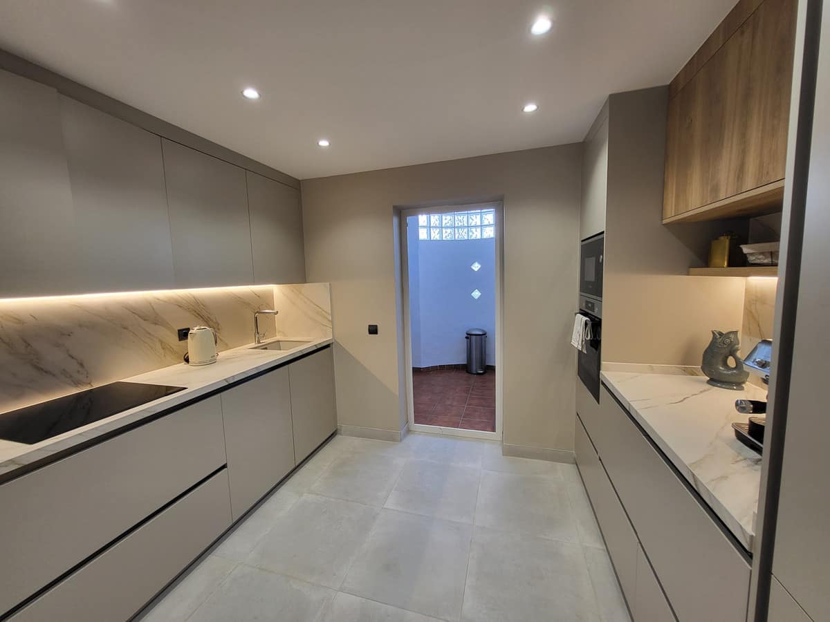 The generous living and dining area opens seamlessly onto a sunny terrace and spacious private garden with open views, ideal for relaxing, entertaining, or enjoying the Costa del Sol lifestyle. The fully fitted separate kitchen is complemented by a large utility room, perfect for everyday living. All three bedrooms are spacious, with the master suite boasting an en-suite bathroom and direct garden access through elegant terrace doors. The covered terrace and private garden create the perfect setting for al-fresco dining and outdoor living.