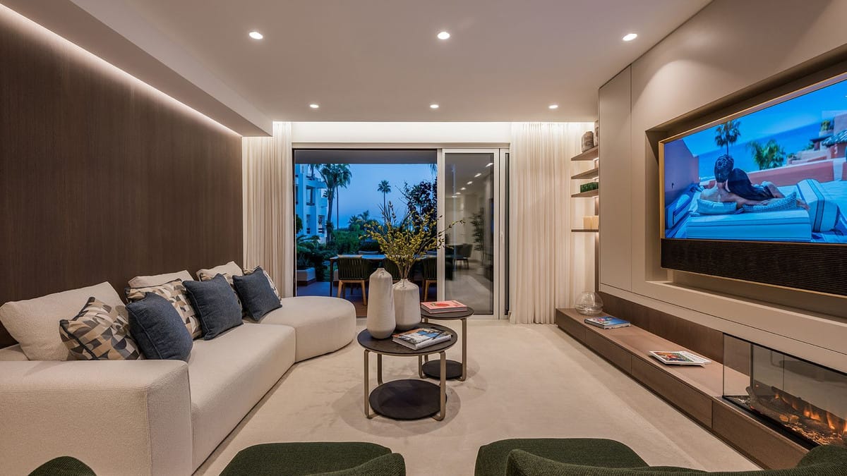 This stunning flat features an open-plan living space with contemporary furnishings and high-end finishes, including bespoke wardrobes, elegant underfloor heating, an electric fireplace and a Bang & Olufsen sound system. The designer kitchen is fully equipped with a concealed hob, making it unique and innovative, and the open-plan living area leads to a private terrace with sea views. Fully furnished and ready to move into.
