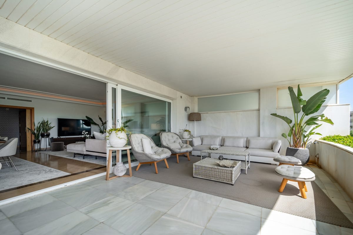This exclusive 3-bedroom apartment is located in one of the most sought-after residential areas on the sea side, next to Puerto Banús. The apartment has three bedrooms, each with en suite bathrooms, a fully equipped kitchen and a spacious living and dining room. The spacious terrace surrounds the entire apartment and offers magnificent views of the well-maintained garden and the sea.
