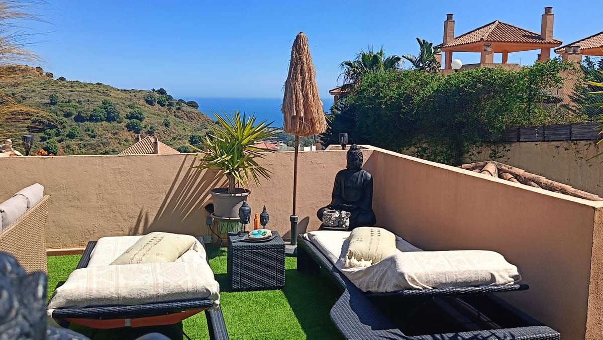Stunning 3-bedroom penthouse with sea views. The penthouse is spread over two floors. The ground floor houses the bedrooms, kitchen, and two bathrooms, with direct access to a large terrace. On the second floor, there is an 80 mm² roofed terrace with a barbecue area and dining area. The complex has a swimming pool. Garage and storage room are included.