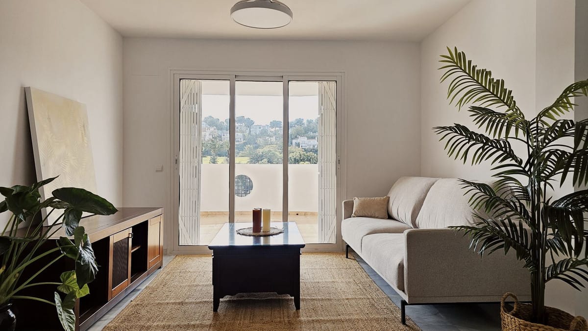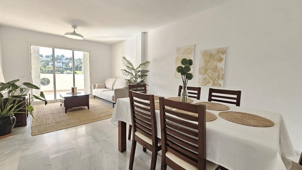 Beautiful 3 bedroom + 2 bathroom apartment for sale in Miraflores area. Spacious south & west facing covered terrace with open green views to the Miraflores golf course and gardens. Nice and quiet location only few minutes drive away from the beach village La Cala de Mijas and the amenities in Riviera del Sol.